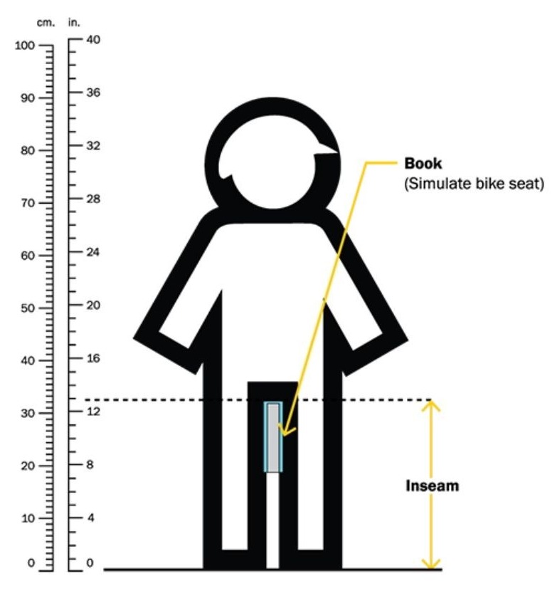 Have your child stand up really straight with their shoes on (you can have them stand with their back to a wall if that helps). Place a book between their legs and slide it up the wall to meet the crotch seam of their pants, just like they were sitting on a bike saddle. Measure from the top of the book to the floor and….BINGO! You have your inseam.