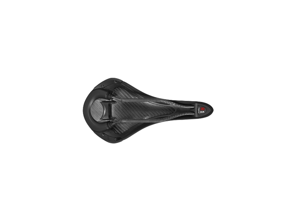 A carbon bike saddle with a composite carbon co-injected nylon TwinFlex shell and a thermowelded black grippy microtex cover.