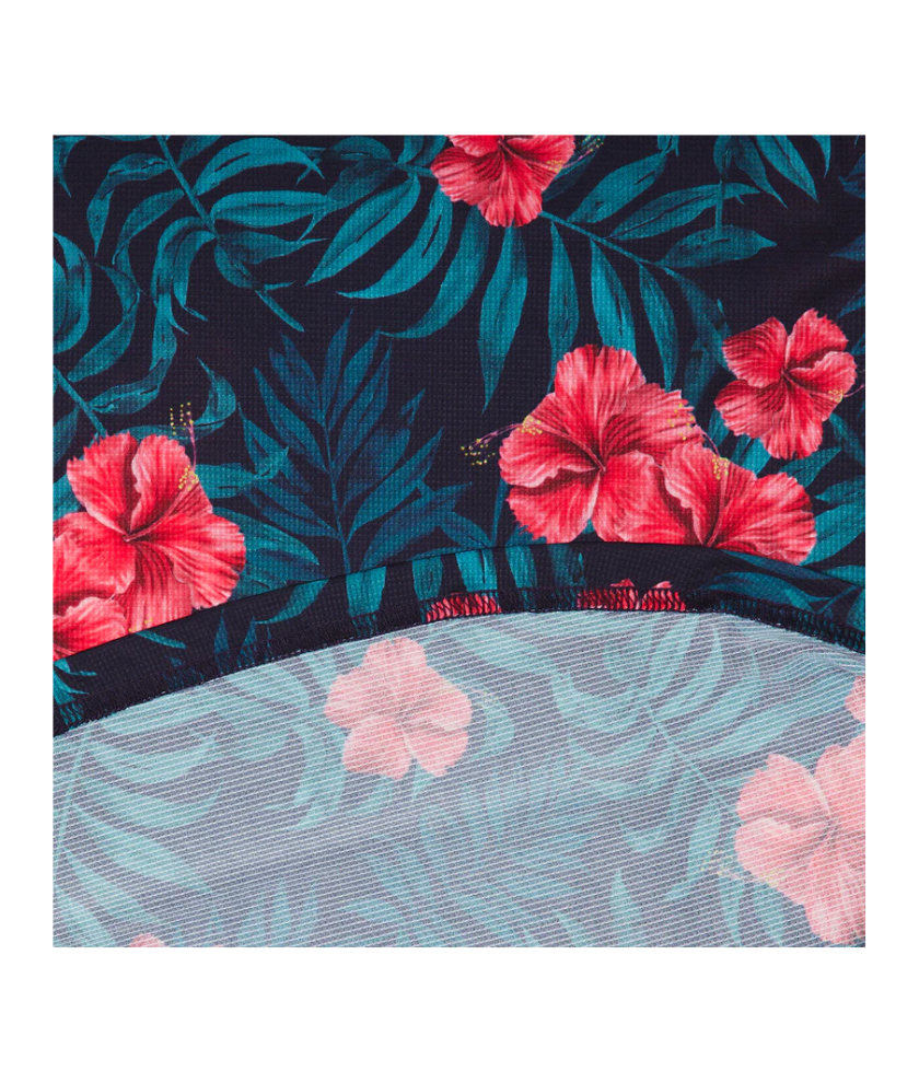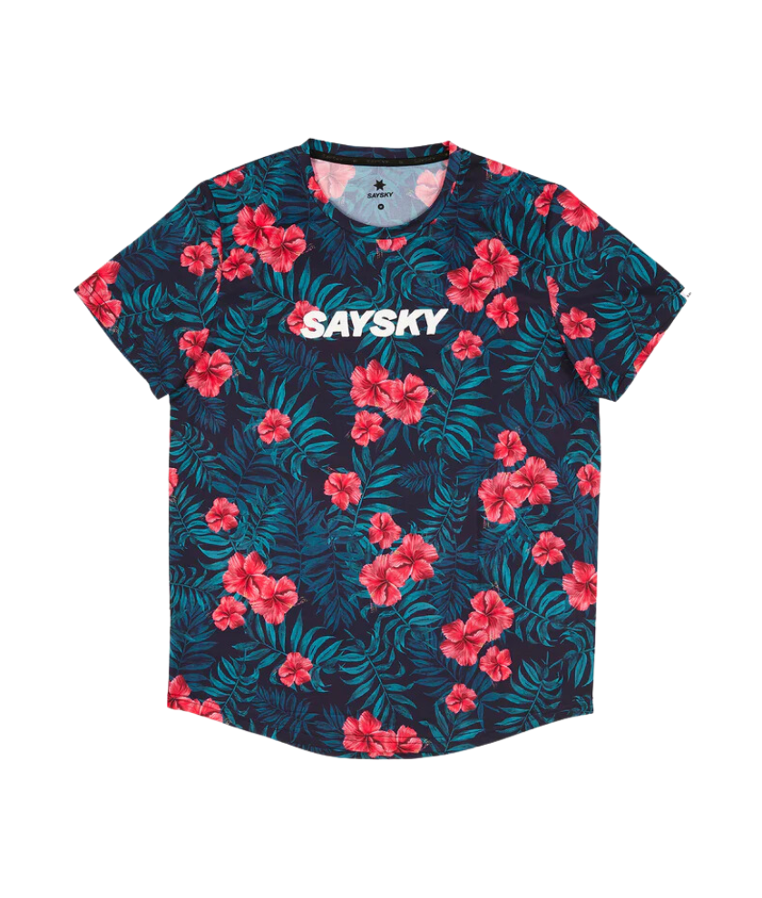 SAYSKY's Flower Combat T-shirt is a men's T-shirt designed for regular fit. The base body color is white, and the front chest is switched with blooming hibiscus print fabric. A white SAYSKY logo is printed on the front chest, and a logo patch is attached to the back side. It has excellent moisture absorption and quick drying properties, ensuring high breathability and keeping you comfortable. It's made from lightweight recycled polyester that's soft to the touch and highly breathable.