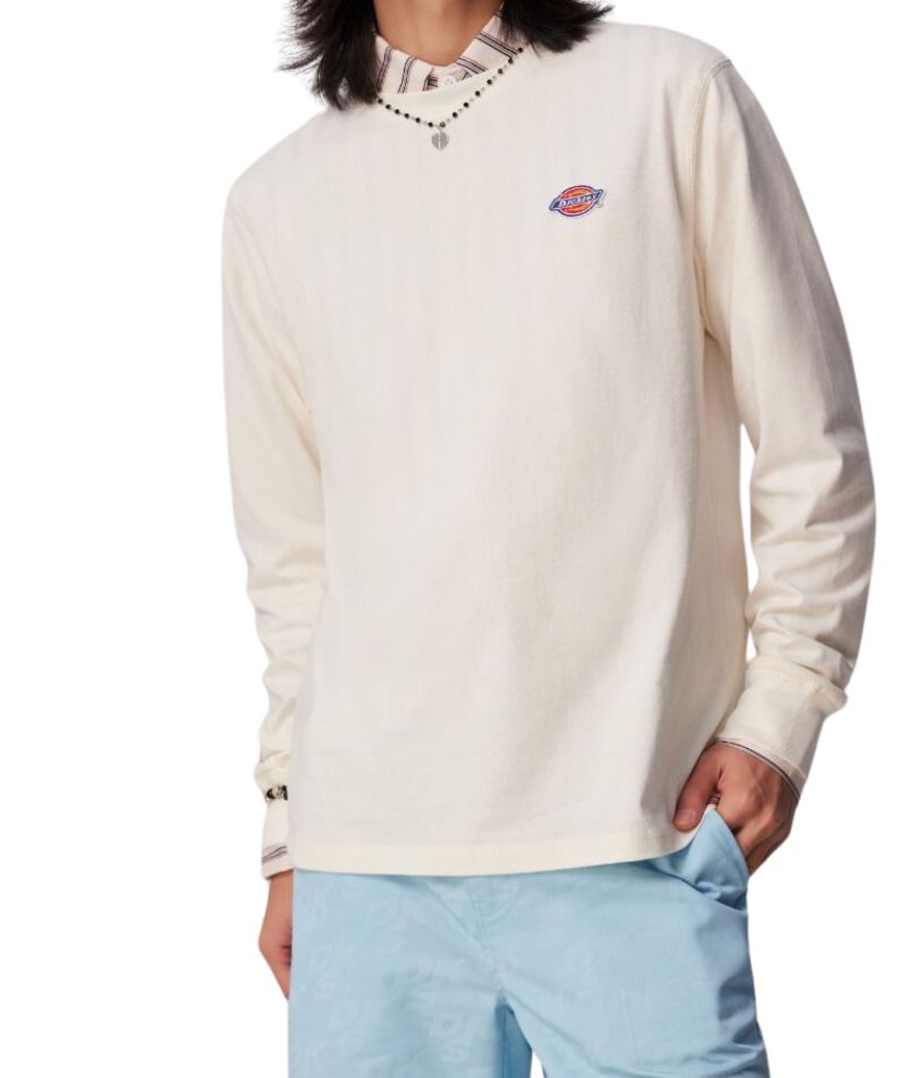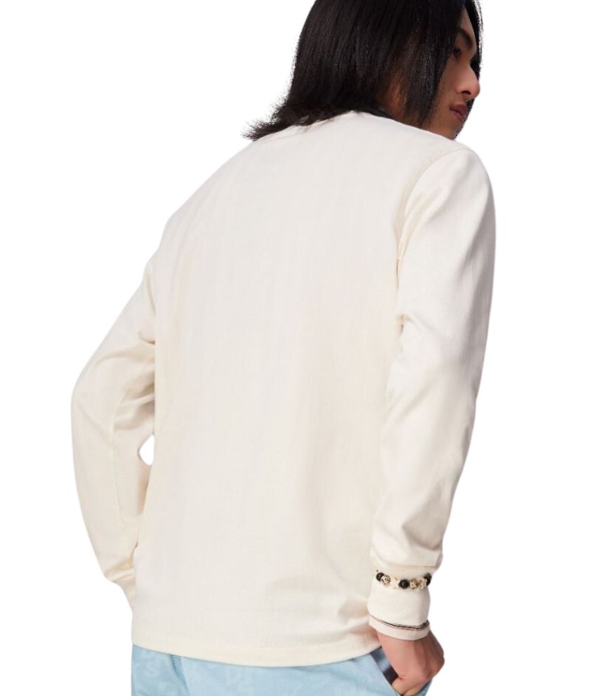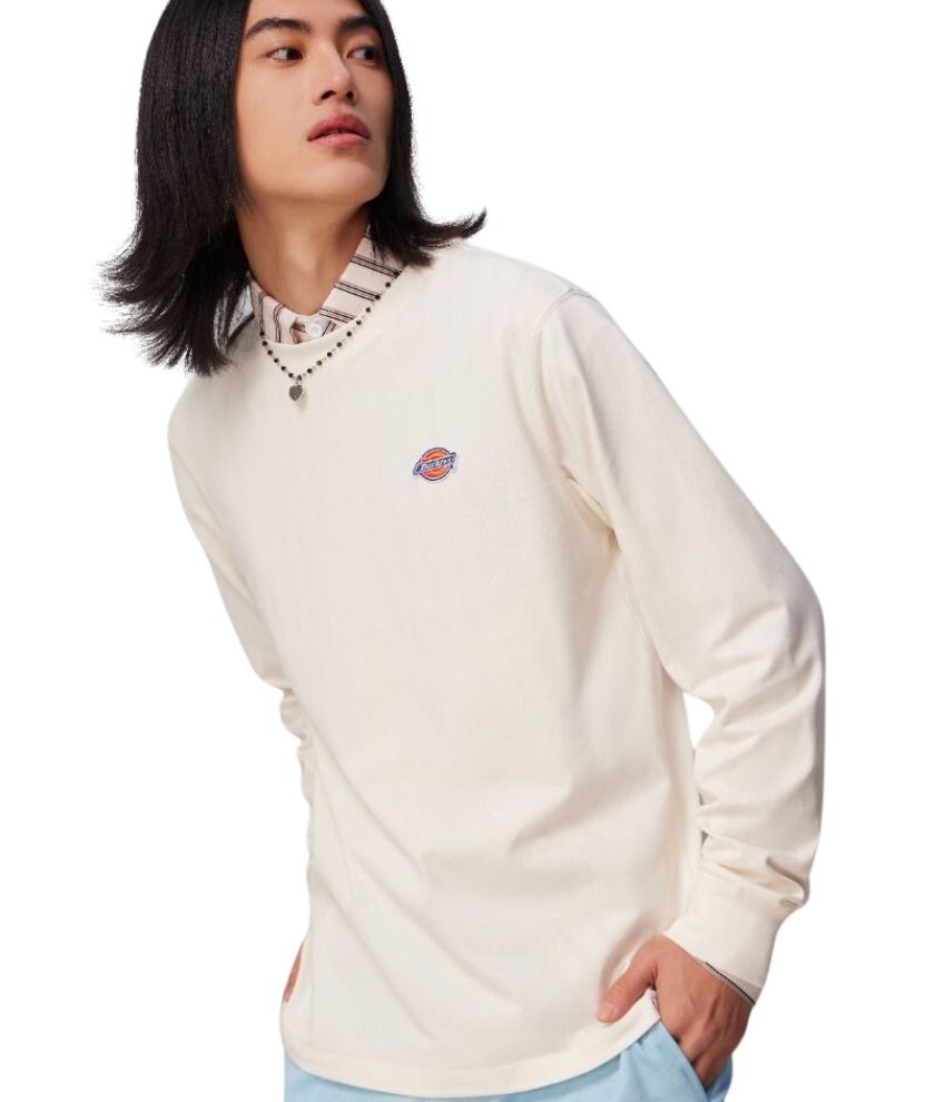 A long-sleeved T-shirt with a smooth texture and comfortable fit. The chest features an embroidered brand logo patch. The flat seam stitching gives a clean impression. The cuffs are ribbed and can be pushed up for a casual look.