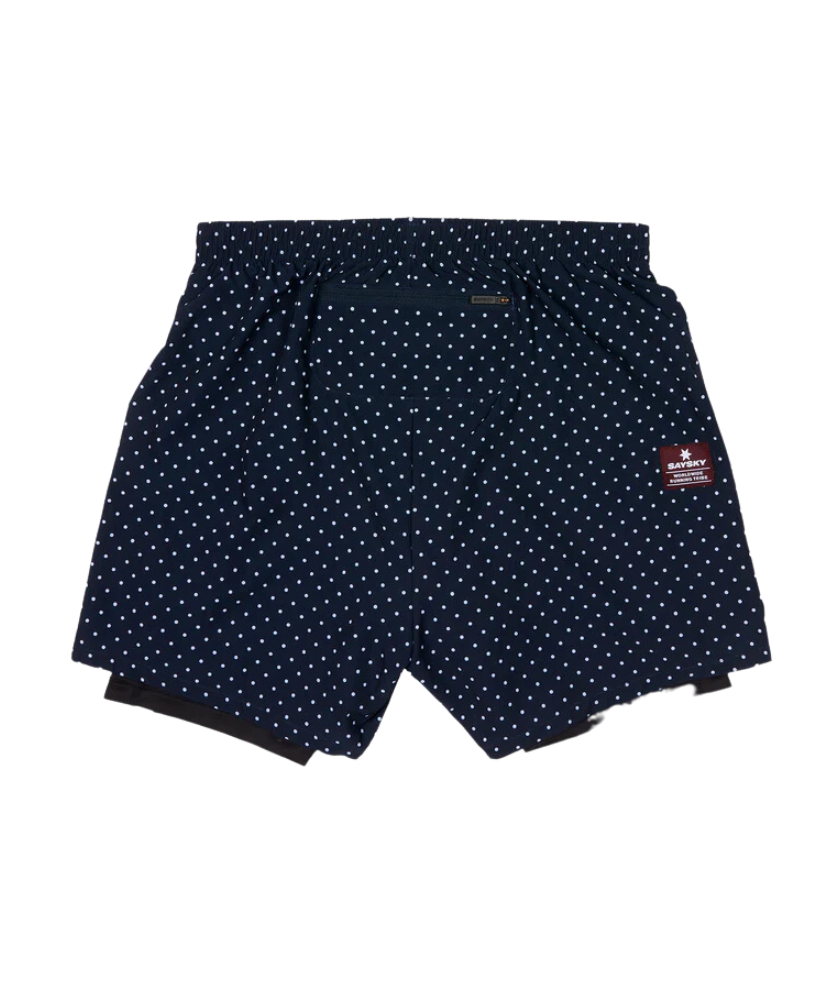 The SAYSKY Polka 2 in 1 shorts 5'' are one of our most popular styles. This version comes in a blue polkadot print with black inner pants. There is a woven SAYSKY label on the front and on the back. The fit is regular with narrow shorts to reduce wavering when going really fast. This style is also ideal for trail running.
