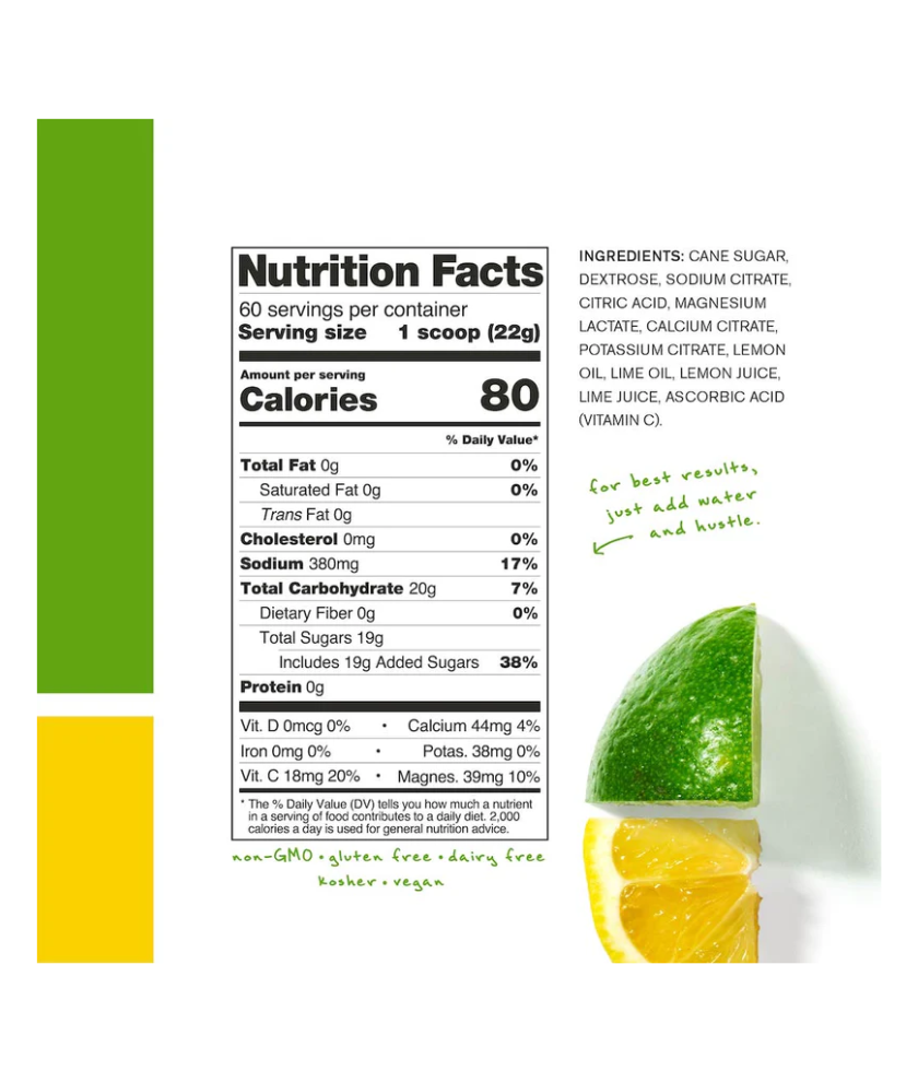 Lemon + Lime: Cane Sugar, Dextrose, Sodium Citrate, Citric Acid, Magnesium Lactate, Calcium Citrate, Potassium Citrate, Lemon Oil, Lime Oil, Lemon Juice, Lime Juice, Ascorbic Acid (Vitamin C).