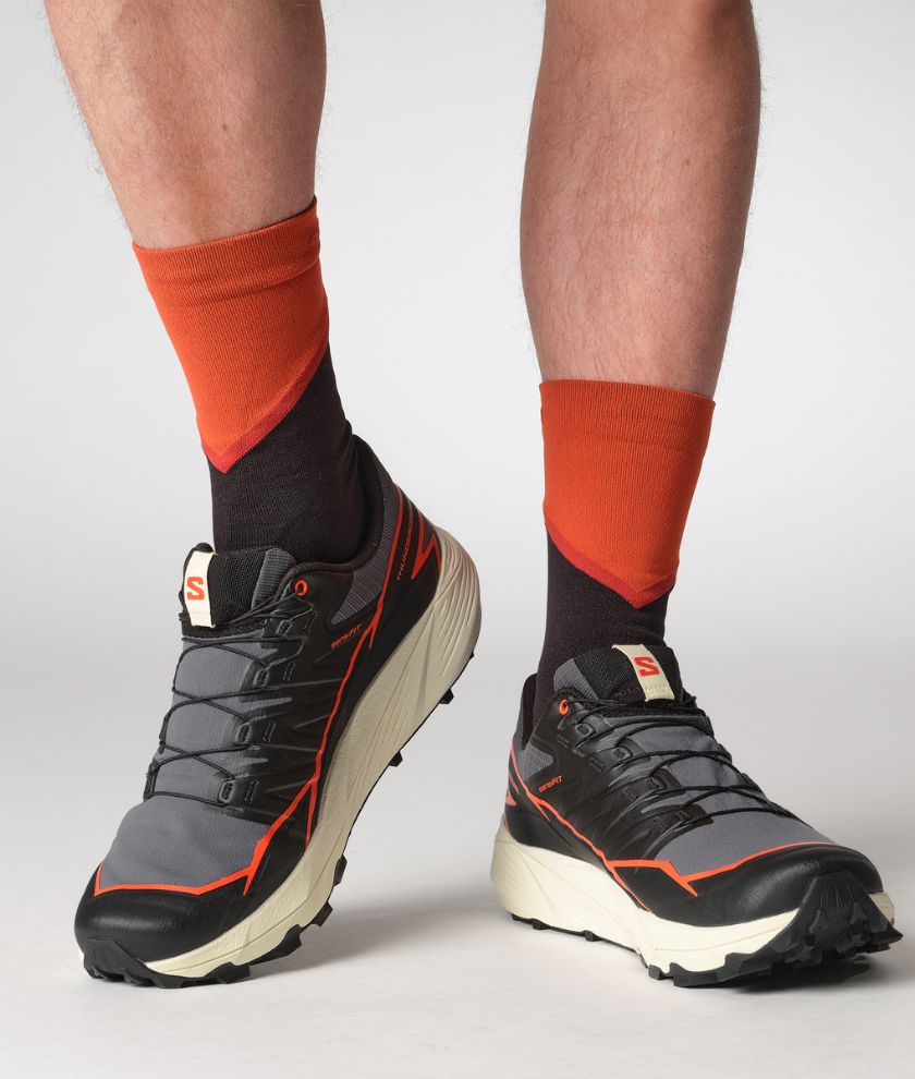 THUNDERCROSS GORE-TEX is a waterproof trail shoe for a dynamic, cushioned ride with superior grip and foothold. Equipped with aggressive 5mm lugs to tackle any terrain, no matter how tricky, technical, or just downright nasty. Developed in the French Alps, tried and tested on everything from rolling terrain to rocky slopes or sticky single tracks.