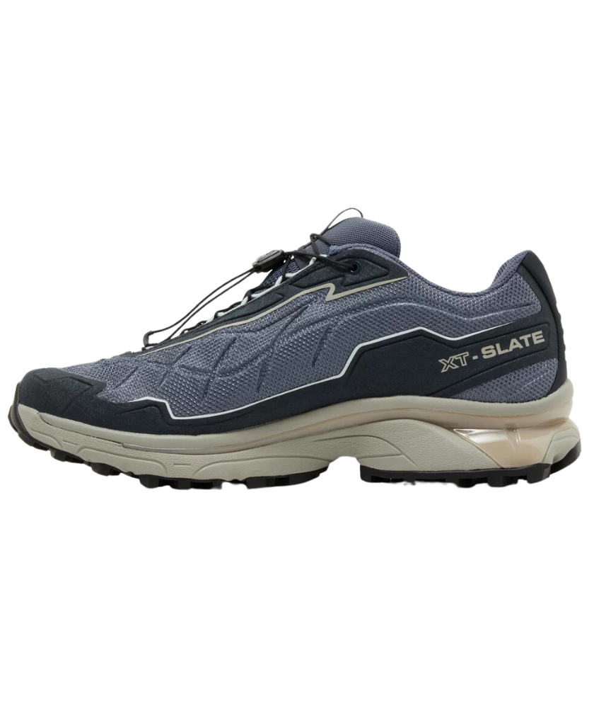A foray into disruptive interpretations of volume, reflecting the irregular landscapes of rocky terrain and trails. XT-SLATE features a waffled and lightweight upper providing textured protection for your feet, and an Advanced Chassis bottom unit for enhanced stability.