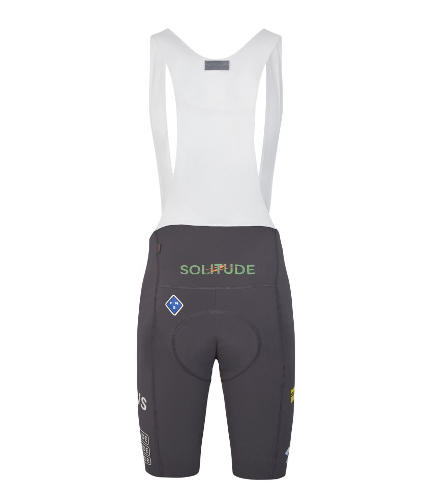 The new Solitude Logo Bibs are constructed from proprietary fabric developed for Pas Normal Studios. The bibs feature unique functional 3D pathways to create air channels to transport heat away from your body effectively. These channels cover the entire area from the hems to the back panel of the bibs, allowing air to circulate easily between your skin and the fabric. The Solitude bibs also provide breathability with the exposed polyester yarn on the inside of the bib shorts. The Solitude Bibs are updated with a new, taller striped silicone in the leg opening to distribute the grip better.