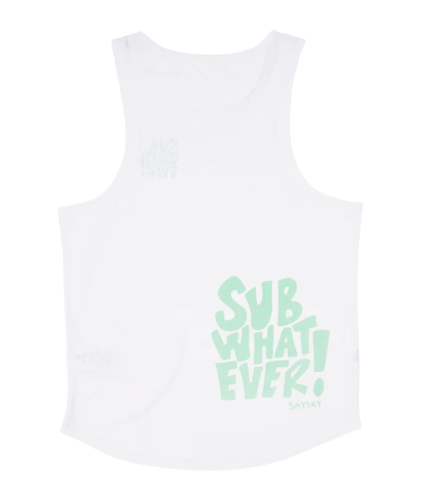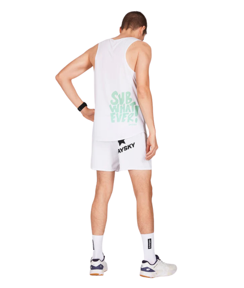 The SAYSKY logo FLOW singlet is designed for runners and athletes who demand the best. The white-collar body has a simple race-fit design, and the "Sub What Ever" statement logo is applied to the front and back. The main material is made of 79% recycled polyester, which is soft to the touch and highly flexible without clinging to the skin.