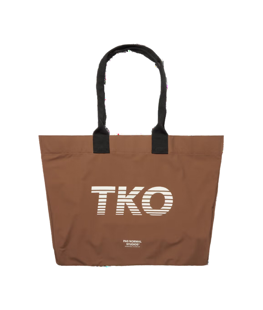 The T.K.O. Logo Shield Bag is constructed with the same Schoeller 3-layer fabric as some of our highly technical cycling gear. The 3-layer construction makes the fabric waterproof and will protect your belongings from light rain on the go. The bag has one big storage compartment and a smaller internal zippered pocket to keep your smaller essentials safe. The Shield Tote Bag has T.K.O. graphics on each side and a smaller minimalistic Pas Normal Studios logo.