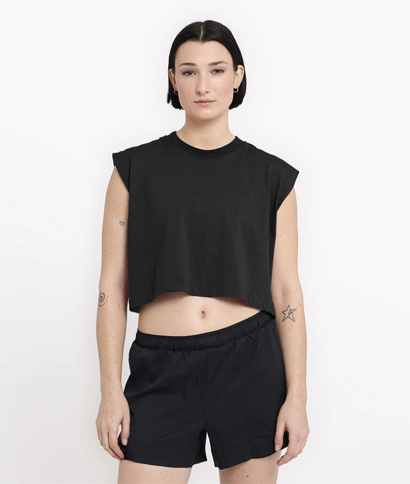 our ORTShirt found love, but also, scissors. we cropped it and cut off the sleeves. we kept it simple and clean (no graphics) and built it in the same midweight recycled cotton we use on our ORTShirt. throw it on over our QCKBra for an early morning easy run.