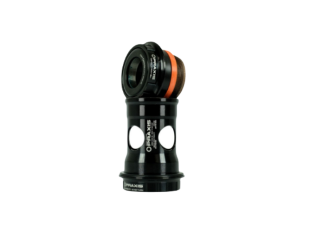 The technology patented by Praxis Works compensates for small tolerances in the frame, thus avoiding annoying pops. When the two shells are twisted together, an elastomer is compressed in a defined way. This elastomer builds up slight pressure on the bearings to seat in the frame free of play.