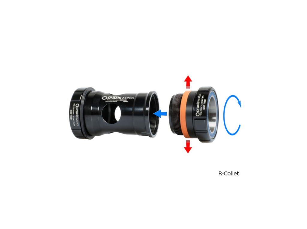 The technology patented by Praxis Works compensates for small tolerances in the frame, thus avoiding annoying pops. When the two shells are twisted together, an elastomer is compressed in a defined way. This elastomer builds up slight pressure on the bearings to seat in the frame free of play.