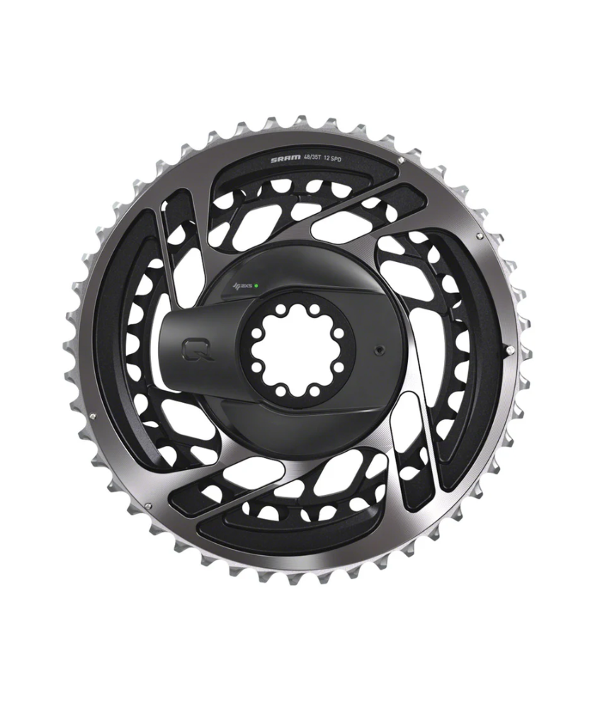 This is the Sram Red AXS™ Power Meter Crankset. This crankset uses X-Range™ gearing technology to give you better, more useful gearing. Sram designed all of the chainring pairs to have a 13-tooth gap to help keep the shifting precise, no matter what chainring size and cassette you are using. Also, the bigger range of gears on the Sram Red AXS cassette allow for smaller chainring sizes without losing any top-end gears. The Quarq DZero power meter is fully integrated into the chainring set to reduce weight. The DZero power meter reading is accurate within +/-1.5% and measures the left and right leg separately.