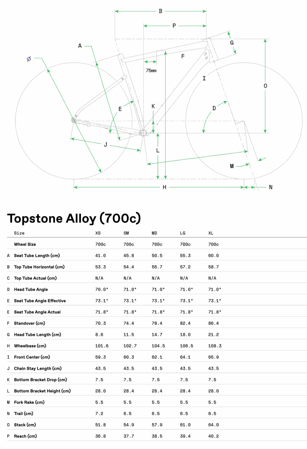 Topstone Carbon, 1-1/8" to 1.5" steerer, 55mm OutFront offset, flat mount disc, internal routing, 12x100 thru-axle, triple bottle/gear mounts, fender mounts