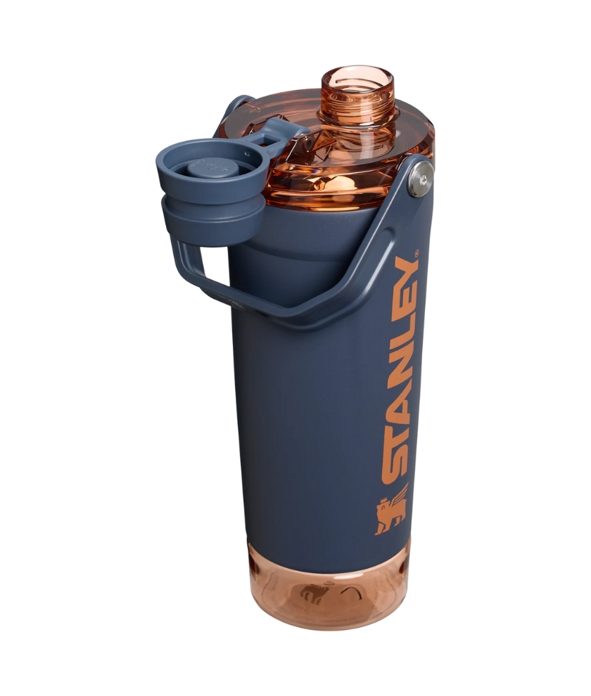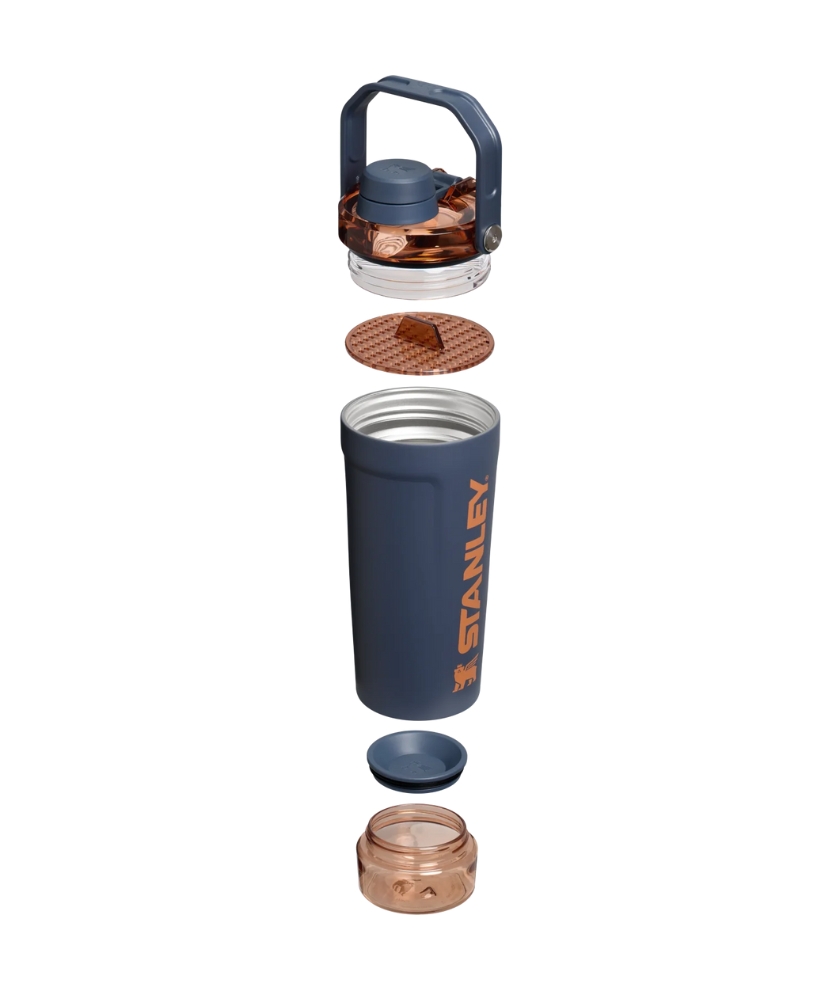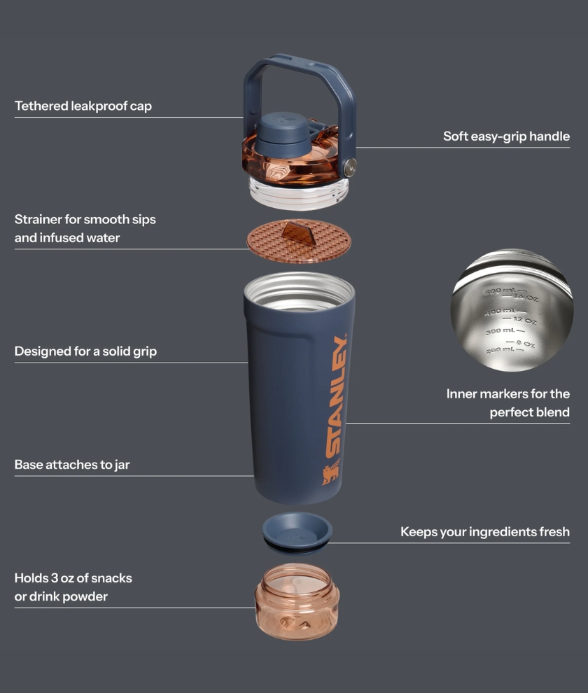 The 20-ounce Activate Shaker Bottle keeps your drink cold for hours, thanks to double-wall vacuum insulation. A rounded interior makes mixing and cleaning easy, while the fast flow spout provides a better sip. The inside is stamped with measurement lines and includes a removable strainer. The base storage container and the soft, easy-grip handle are great for on the go. And with a leakproof Tritan lid, it’s ready to toss in your bag.