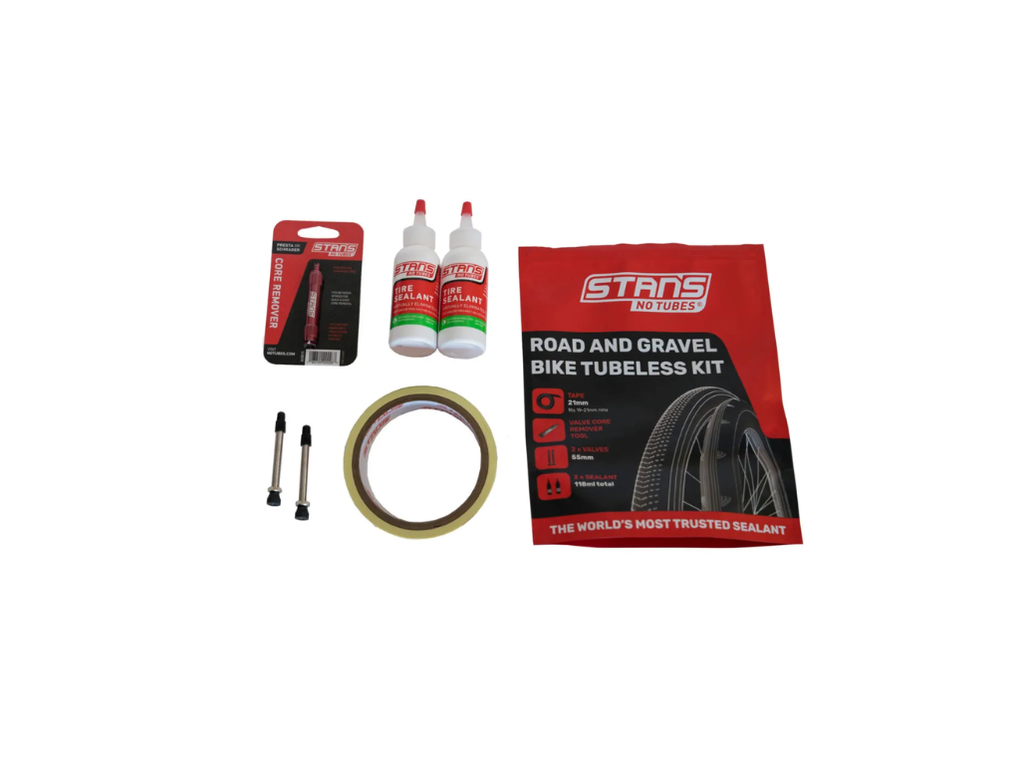 The Stan's NoTubes Road Tubeless Kit contains everything you need to get riding on a tubeless set-up with your tubeless-ready rims! It includes Stan's NoTubes Tyre Sealant, 2 x Stan's NoTubes Universal 55mm Presta Valve Stems and a roll of Stan's NoTubes 25mm Rim Tape. Now all you need is to spend the time getting your tubeless rims fully set-up! Have no more worries when you're out on the trails thanks to the Stan's NoTubes MTB Tubeless Kit.