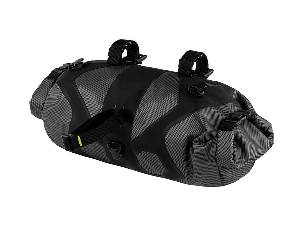 Eliminating the need for a bulky front rack, the bag fastens to handlebars with a reinforced attachment system that adds stability while improving handling and preventing abrasion. Dual roll-top closure keeps the contents secure, while allowing flexible packing capacity. A hands-free air release vent makes compressing the bag hassle-free, while welded seams ensure that contents stay dry in all conditions.