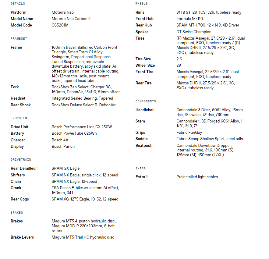 Specifications for Moterra Neo Carbon 2 E-Bike
