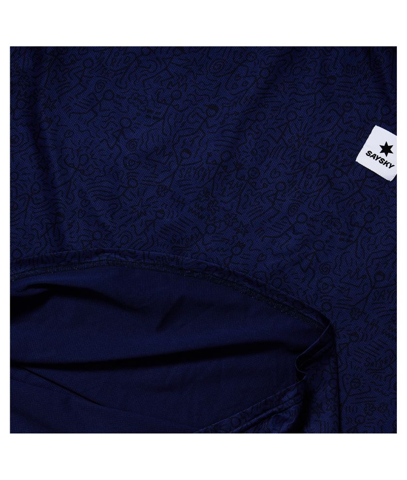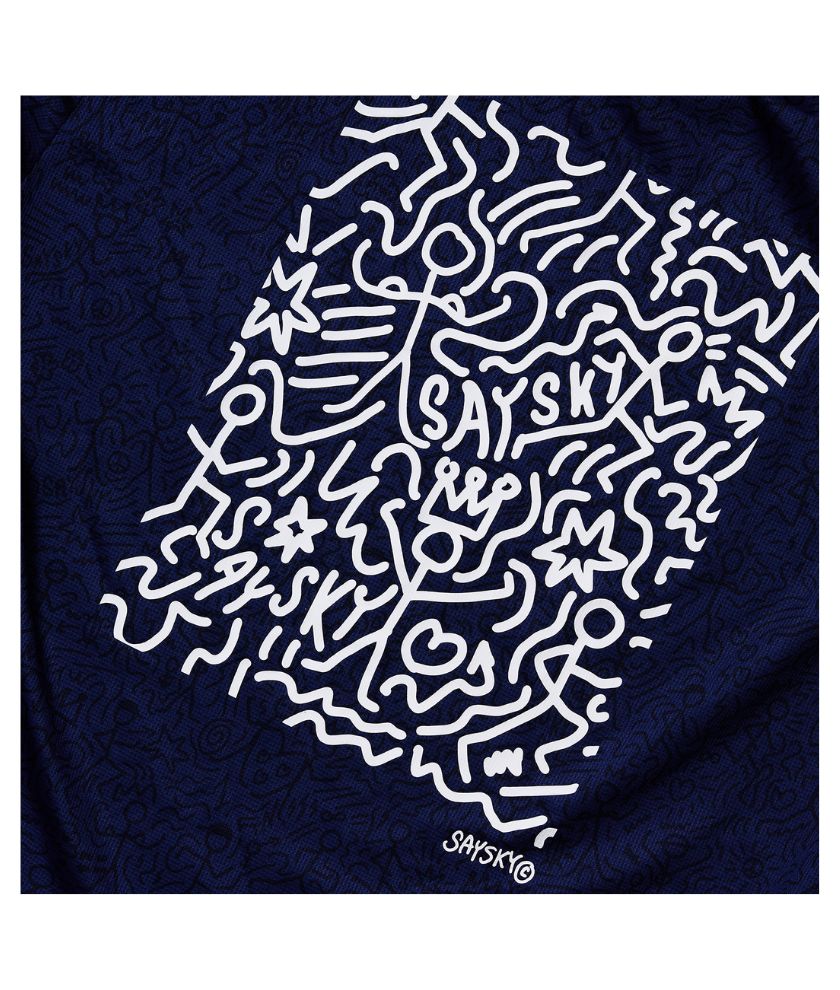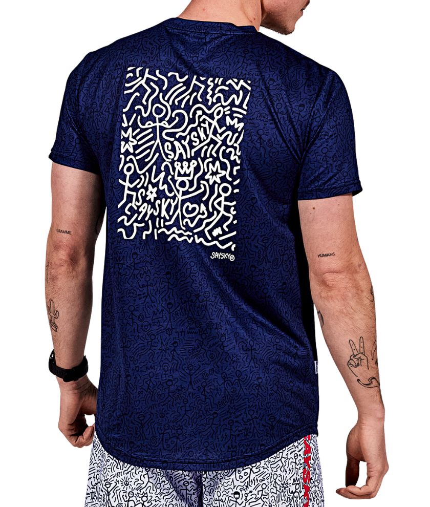 The SAYSKY Contemporary Cartoons Combat T-shirt is a men's short sleeve running t-shirt in dark blue with an all over hand drawn stick figure animation print as well as a big print on the back and a woven SAYSKY logo on the front. The T-shirt is moisture-wicking and quick-drying, which ensures high breathability and increased airflow. The technical construction reduces the fabric’s ability to cling to your skin.