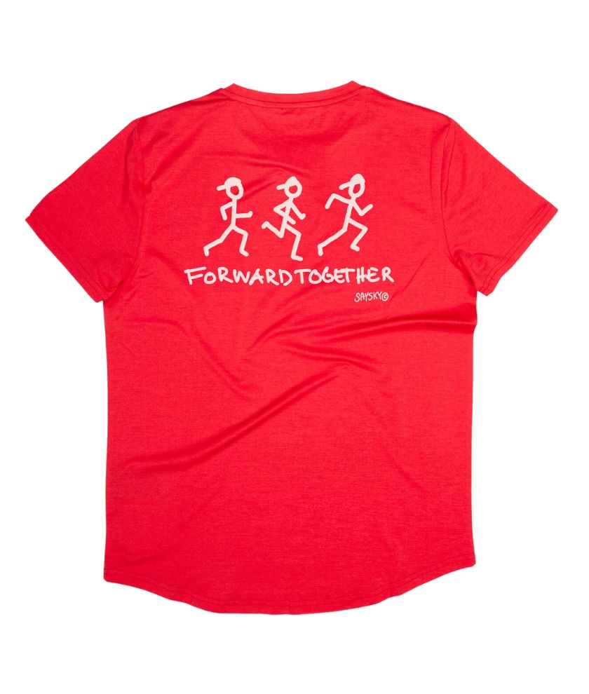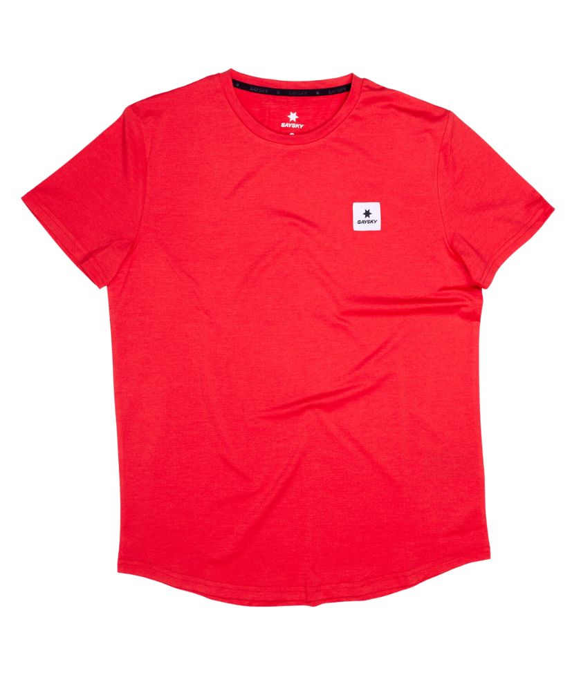 The SAYSKY CC Pace T-shirt is a men's short-sleeved T-shirt in red melange with a print on the chest and a large print on the back. It is made from recycled polyester. The fit is regular, with a super soft fabric and good moisture-wicking properties.
