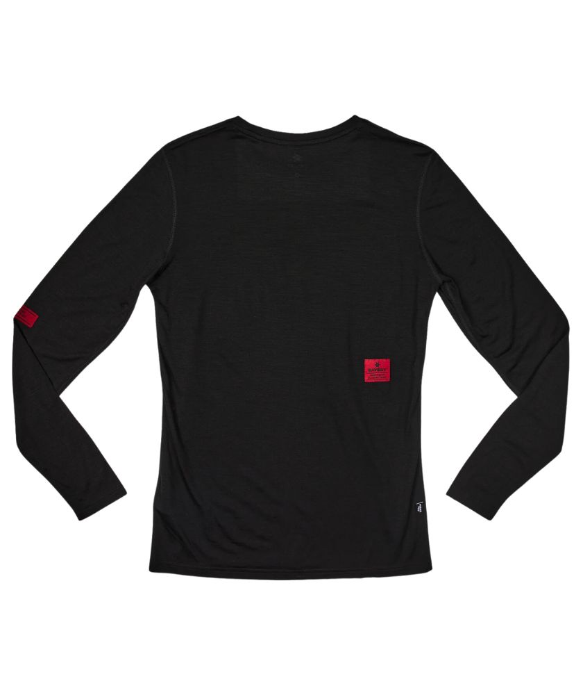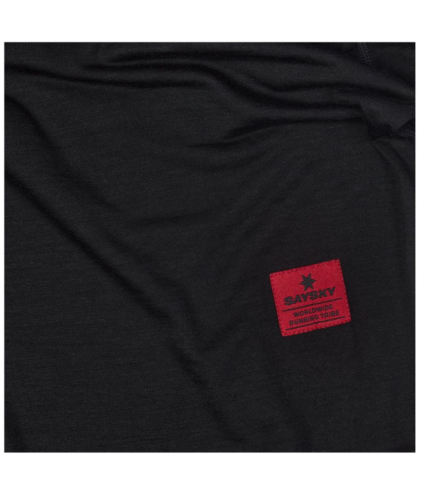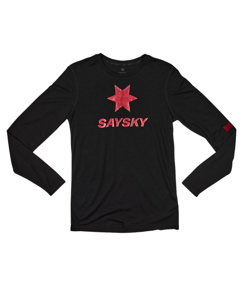 The SAYSKY Merino Base 150 Long Sleeve is a Merino and Tencel running t-shirt. The mix of Tencel and Merino gives the t-shirt a super soft and light feeling. Pair it with a running jacket and you're ready to take on the harshest of conditions. It comes in black with a red SAYSKY logo on the front, and a woven red SAYSKY label on the back and arm. The fit is slim.