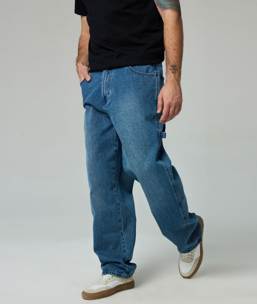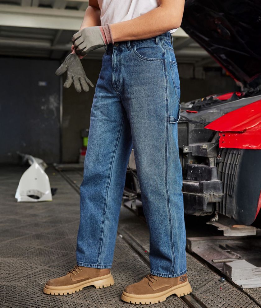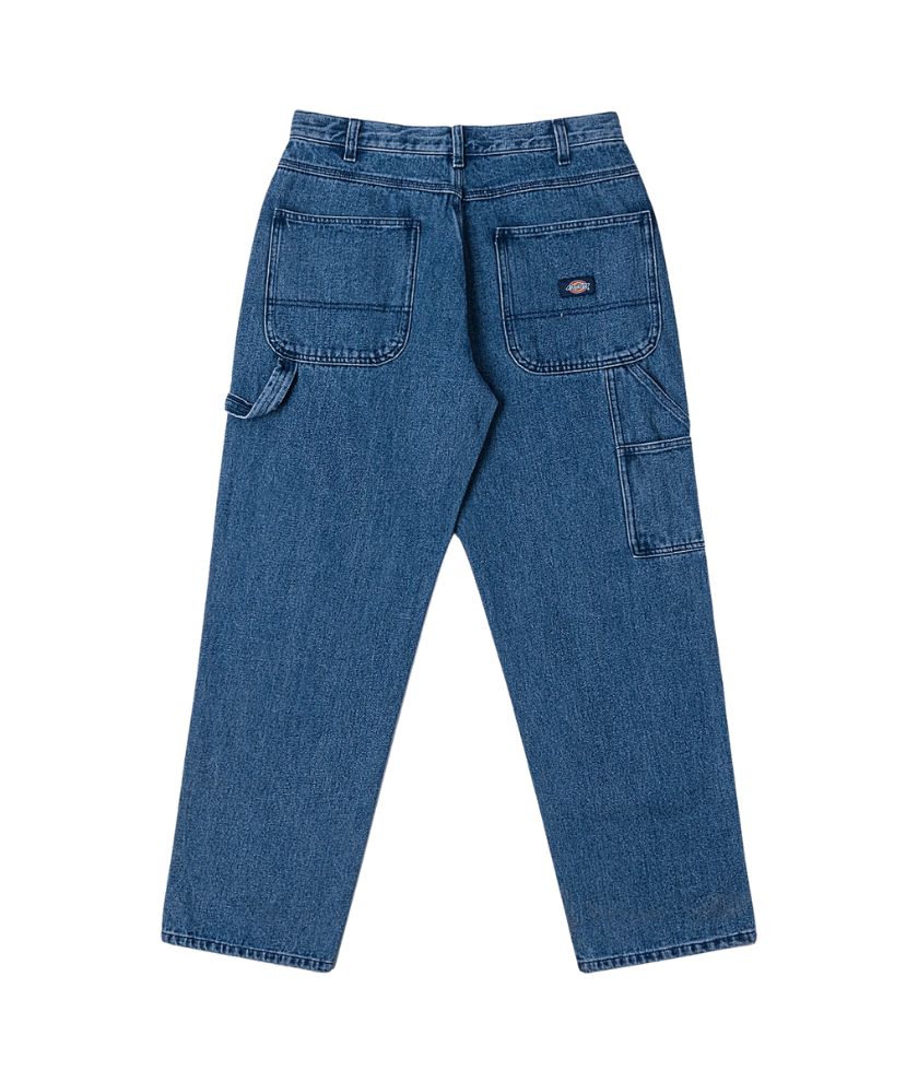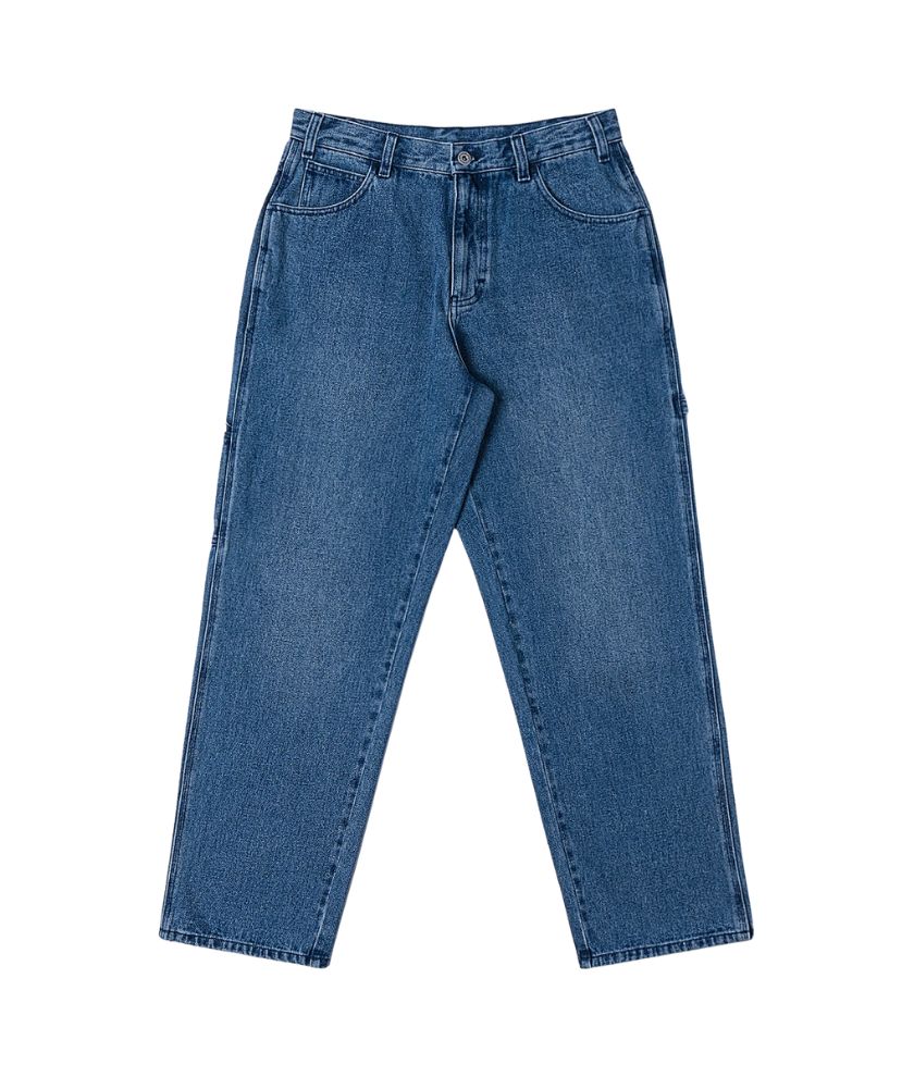 Workwear-like denim pants with a hammer loop and tool pockets on the sides. They feature a roomy wide form and a gently tapered silhouette. Made of 100% cotton denim, they are comfortable to wear. The vintage, faded texture with a used feel also adds a touch of sophistication to your casual style.