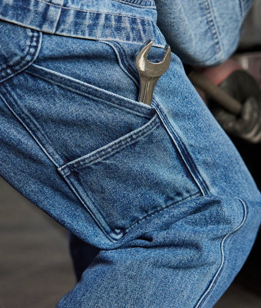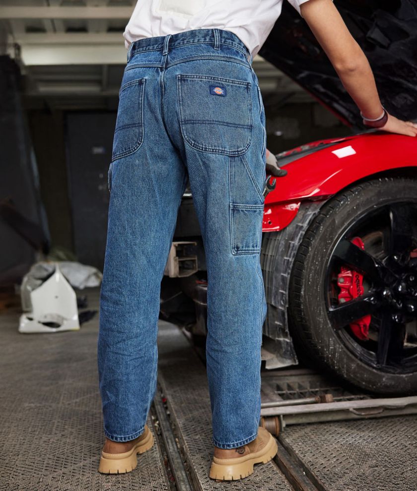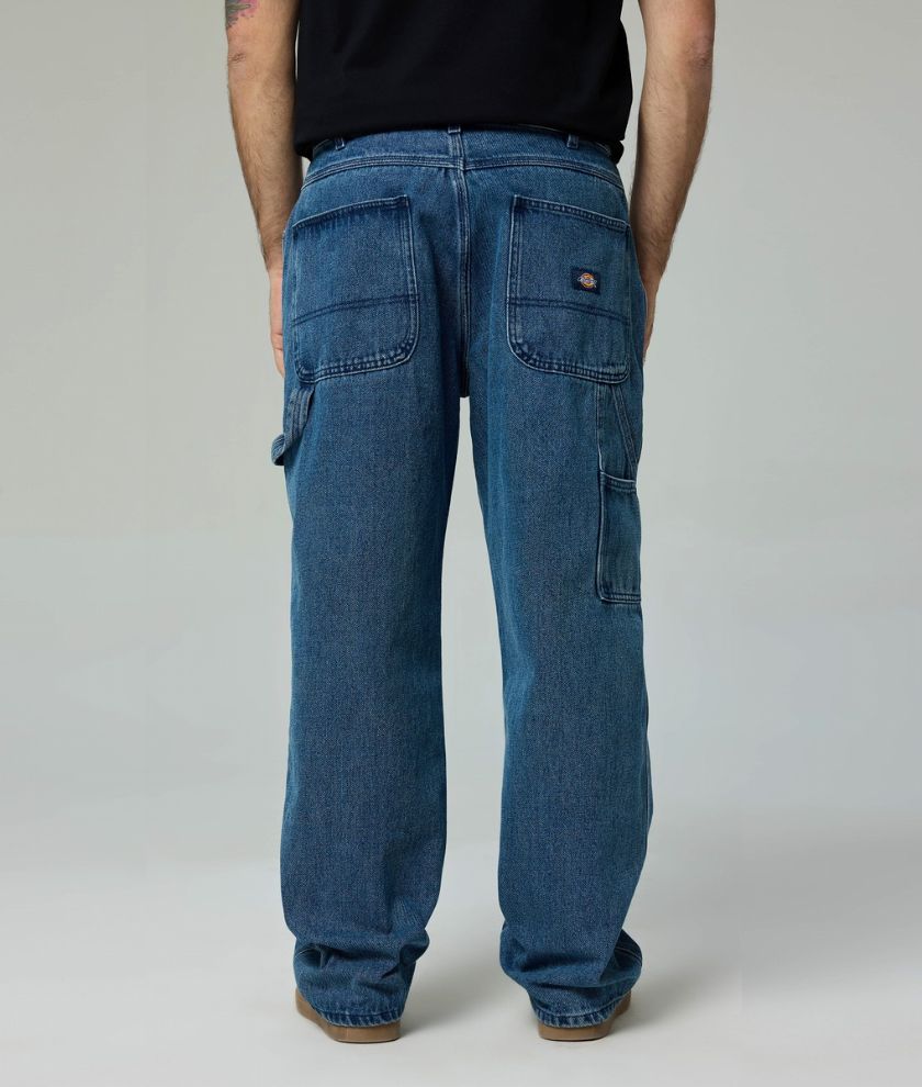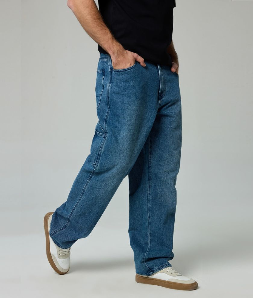 Workwear-like denim pants with a hammer loop and tool pockets on the sides. They feature a roomy wide form and a gently tapered silhouette. Made of 100% cotton denim, they are comfortable to wear. The vintage, faded texture with a used feel also adds a touch of sophistication to your casual style.