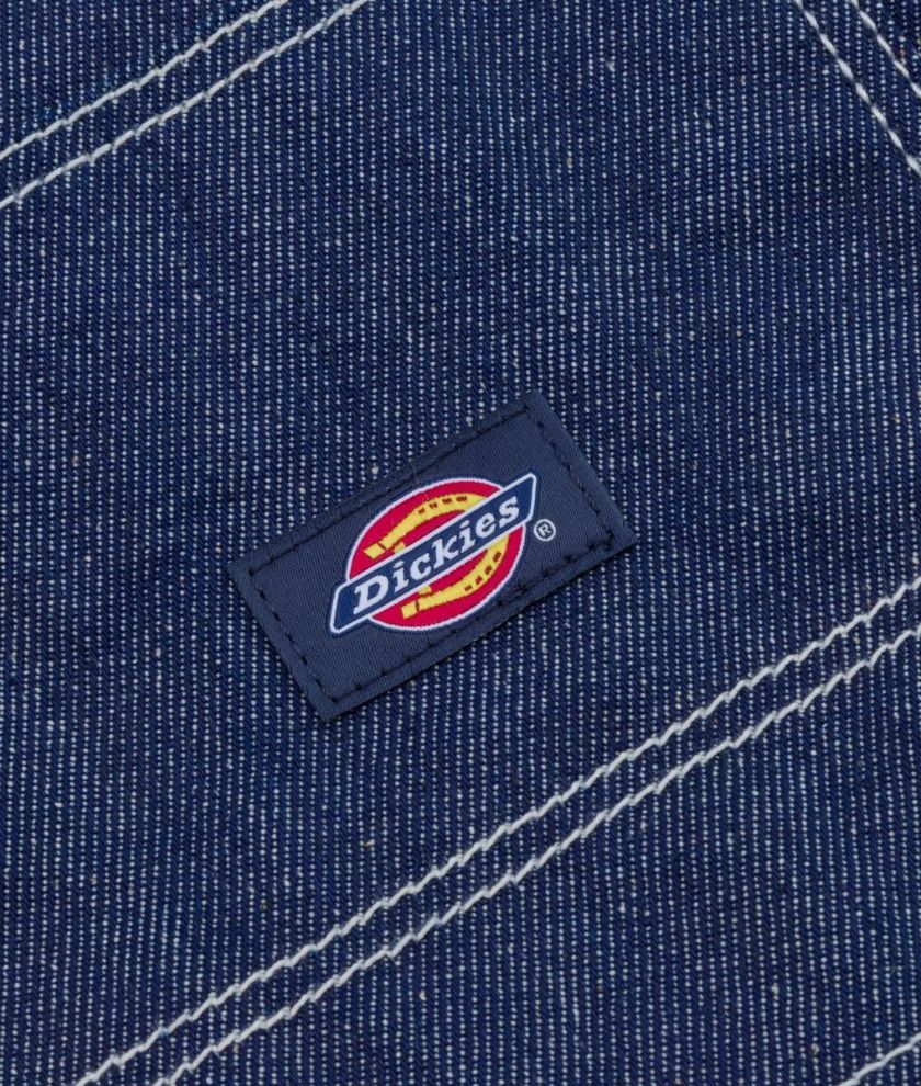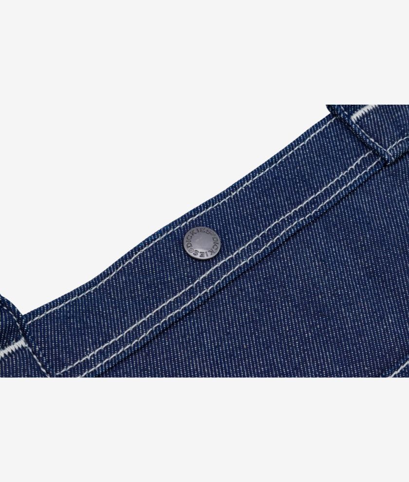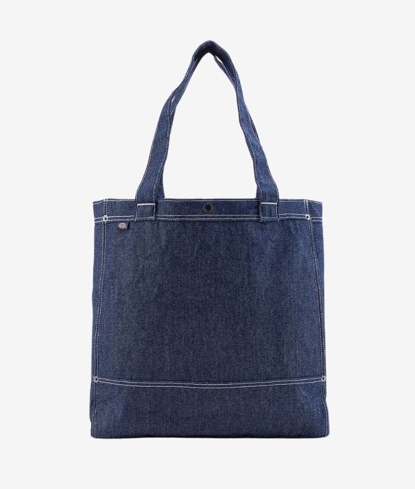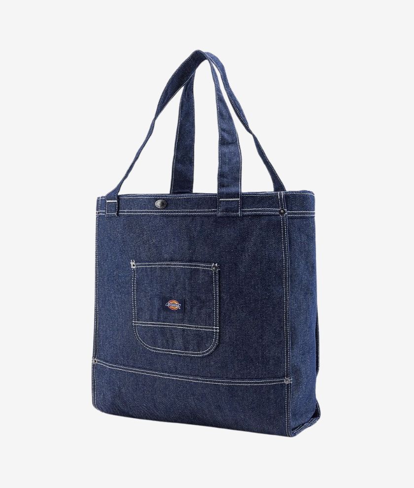 A workwear-inspired tote bag made from 100% cotton. The bag is made from thick denim with vertical service pinstripes, metal studs and a metal snap closure. There is an external pocket for extra storage and the bag features the signature Dickies woven label.
