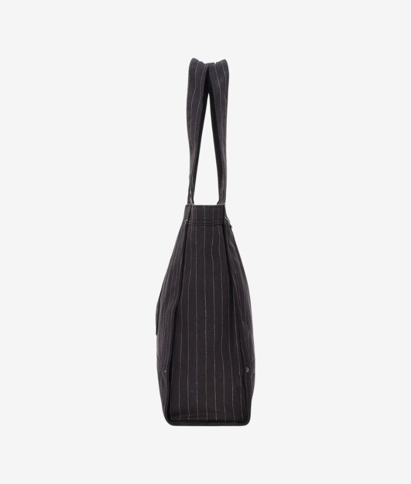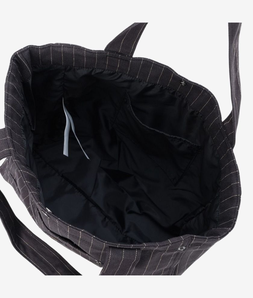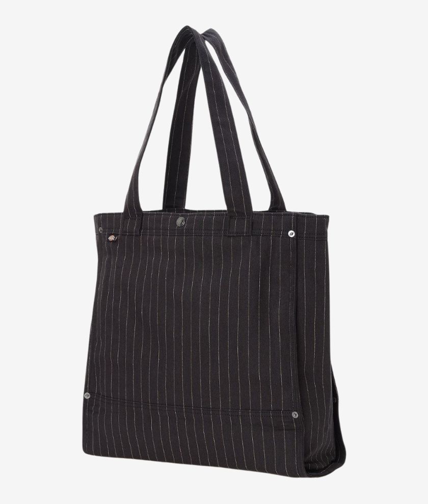 A workwear-inspired tote bag made from 100% cotton. The bag is made from thick denim with vertical service pinstripes, metal studs and a metal snap closure. There is an external pocket for extra storage and the bag features the signature Dickies woven label.