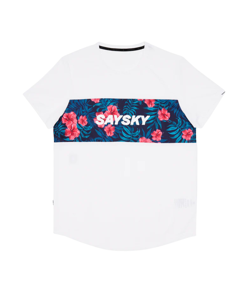 SAYSKY's Flower Combat T-shirt is a men's T-shirt designed for regular fit. The base body color is white, and the front chest is switched with blooming hibiscus print fabric. A white SAYSKY logo is printed on the front chest, and a logo patch is attached to the back side. It has excellent moisture absorption and quick drying properties, ensuring high breathability and keeping you comfortable. It's made from lightweight recycled polyester that's soft to the touch and highly breathable.
