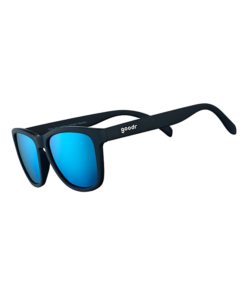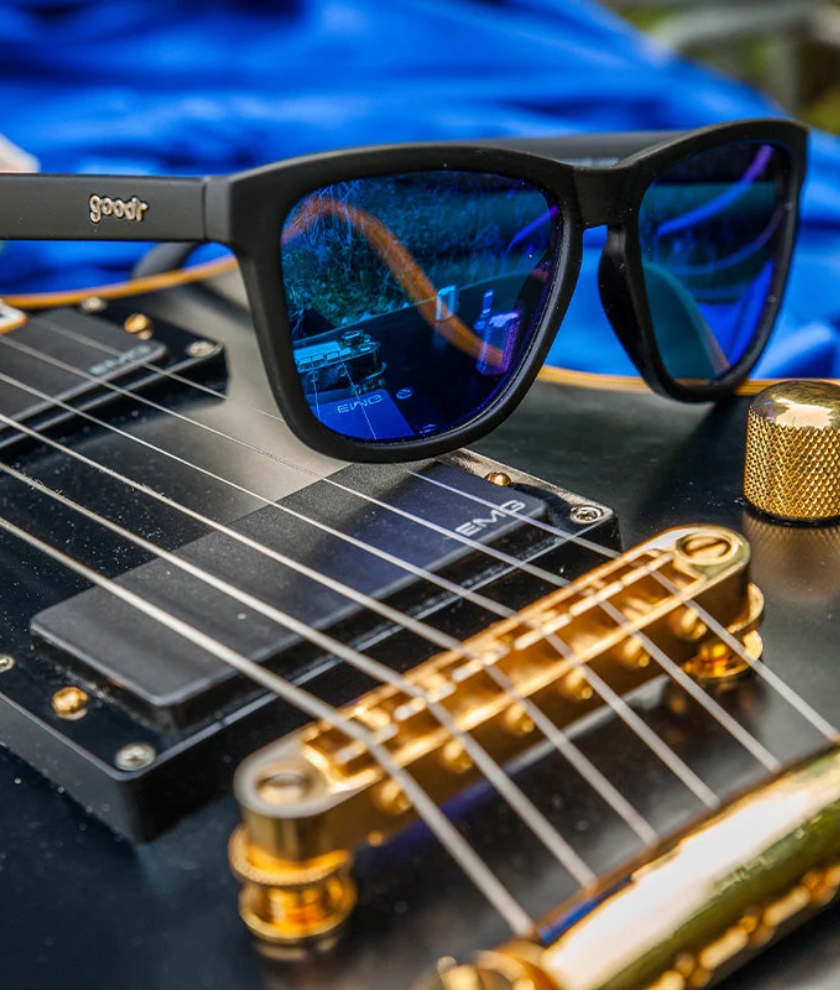 These black and blue sunglasses offer the best of both worlds: sleek black frames with a pop of color. A special grip coating prevents slipping and bouncing, making them ideal for running, golfing, frolfing, cartwheeling, and other sweaty activities. The ultimate duo: business in the frame, party in the lens.