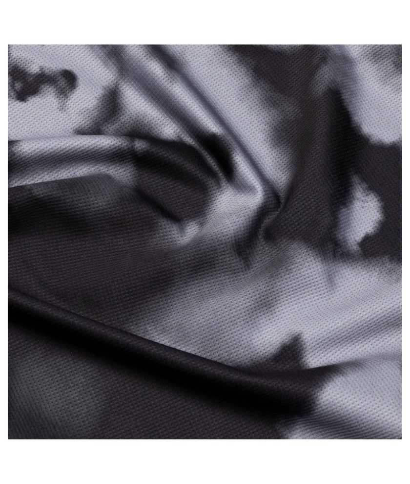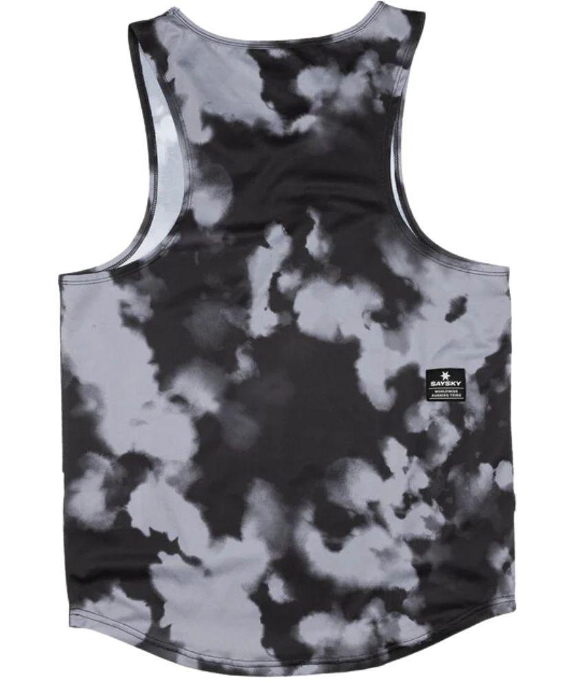 SAYSKY's Cumulus Combat Singlet is a racing singlet printed with a gray and black cloud design. The front chest has the SAYSKY logo, and the back side has the SAYSKY logo patch. It has a slim fit and is made for racing. The ultralight and breathable fabric keeps you comfortable while you run.