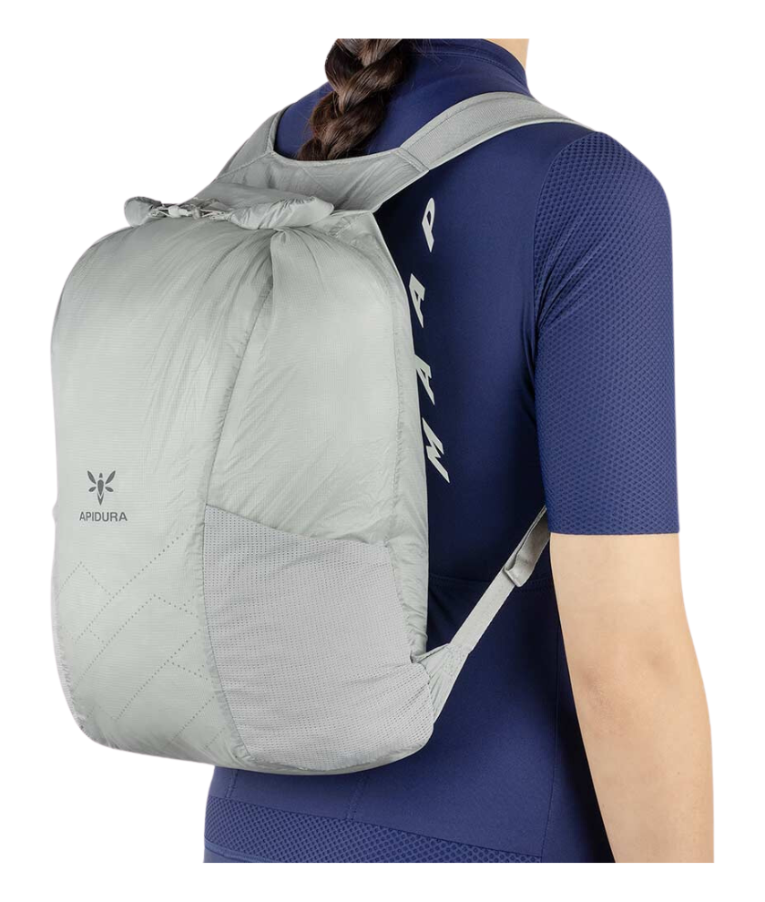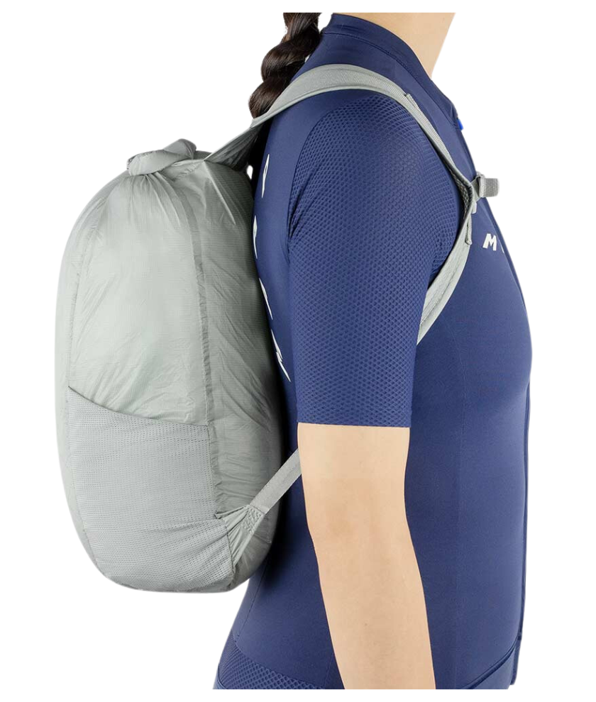 The Packable Backpack is waterproof, constructed from ultralight materials and features cycling-specific contoured shoulder straps for riding comfort. The integrated on-bike storage pocket attaches to the bike frame with an included velcro strap to keep the packable daypack out of the way when not in use.