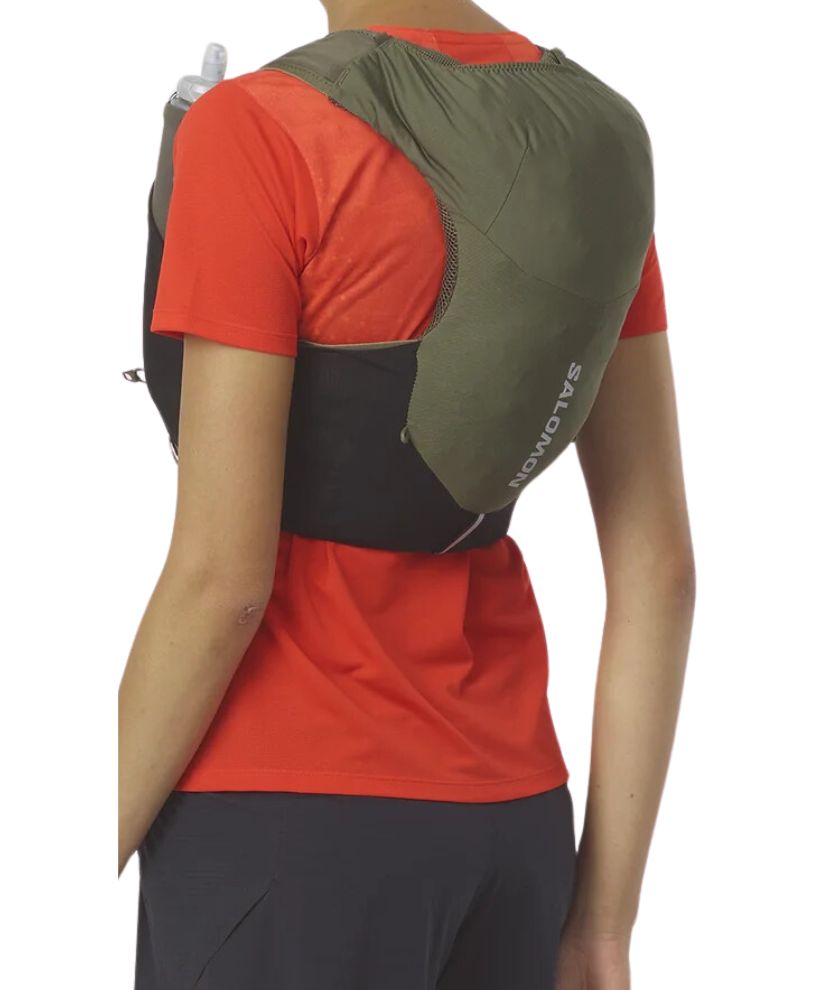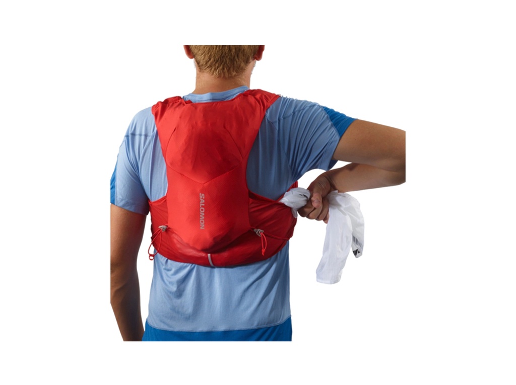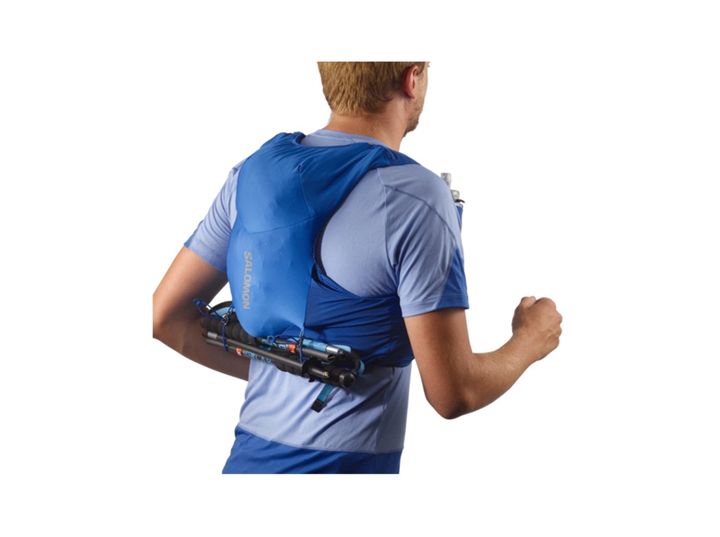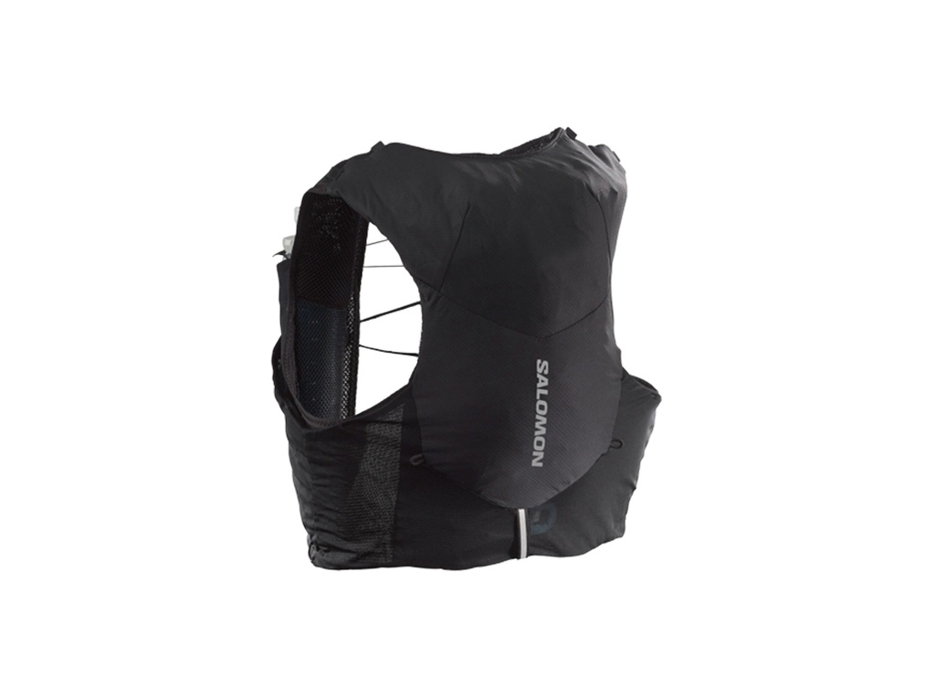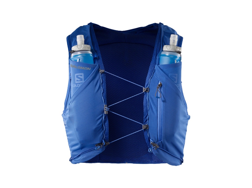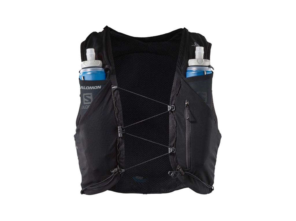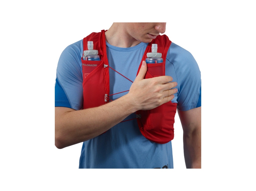 -2 Front Bottle Pockets : Designed to hold Salomon soft flasks, these front pockets reduce the bouncing effect. The upper elastic loops keep your bottles perfectly within reach.