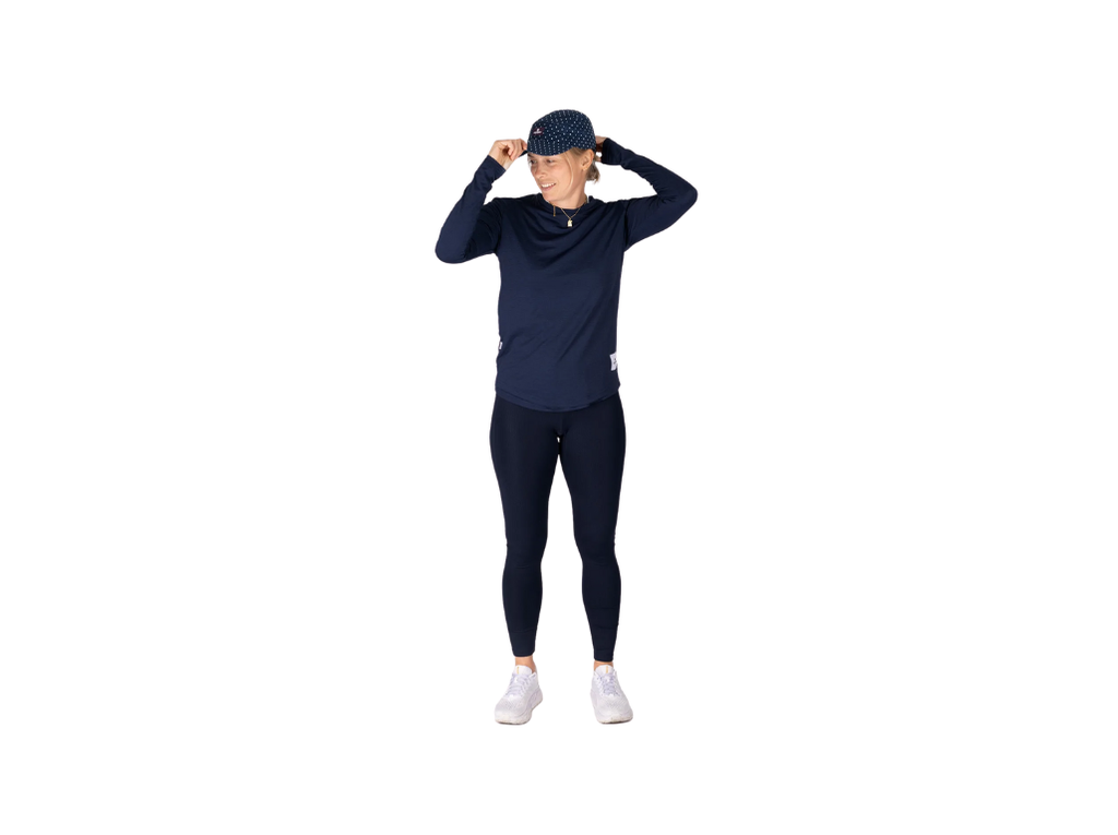 The SAYSKY Reverse Cap is a reversible 5-panel cap made for running. It is made from recycled polyester. One side has a blue polkadot print and the other side is blue.