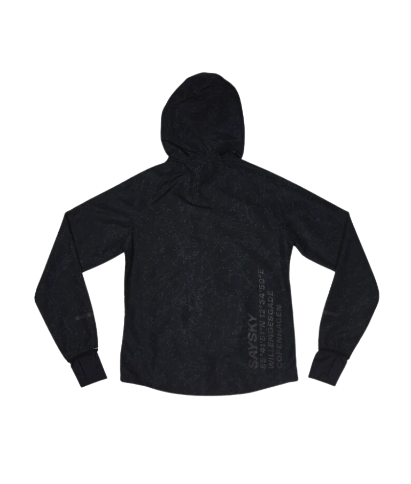 SAYSKY's Women's Map Pace Jacket is a wind-resistant running jacket for women. Made from lightweight, breathable fabric with a comfortable fit. With an all-over print of Copenhagen origin, the front chest has a SAYSKY logo patch, and the backside has a reflective print of the statement logo representing SAYSKY's location.
