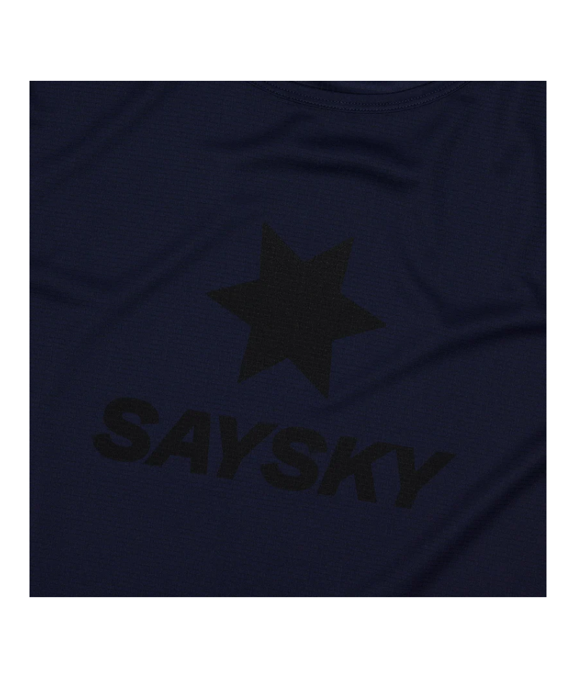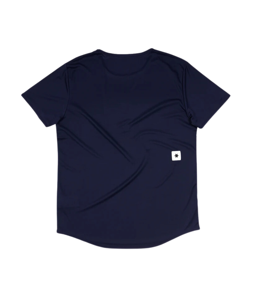 The SAYSKY Logo FLOW Tee is designed for runners and athletes who demand the best. It has a simple design with a purple colored body and a race fit, and the classic SAYSKY logo is printed in black on the front. A white SAYSKY label is woven into the backside. The main material is 79% recycled polyester, which is soft to the touch and highly flexible without clinging to the skin, making it highly functional and ultra-lightweight.