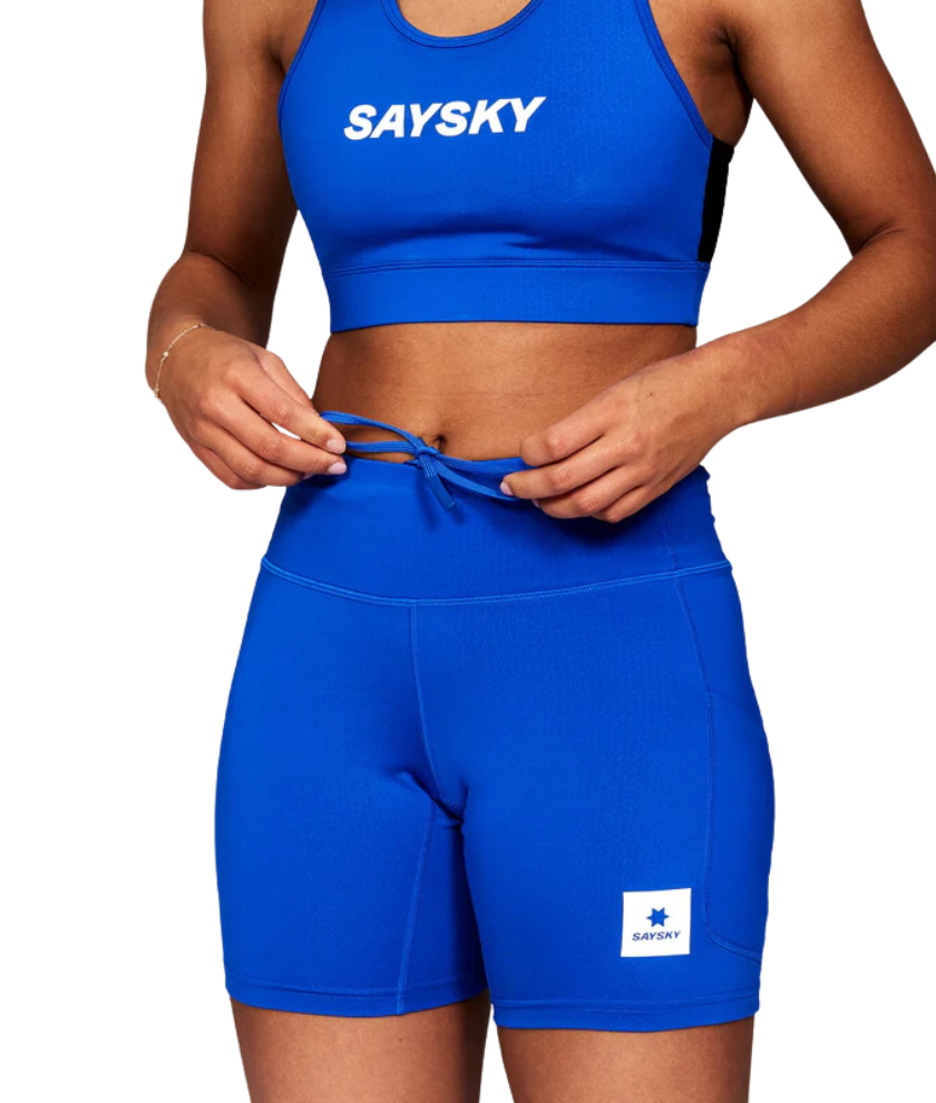 SAYSKY's Women's Combat+ Short Tights 7 inches are perfect for running or the gym. The blue body features a white SAYSKY logo printed on the front hem and back waist. It has a side pocket for your smartphone or snacks. Made from recycled polyester, it is very soft to the touch and has a comfortable stretch that fits all body types.