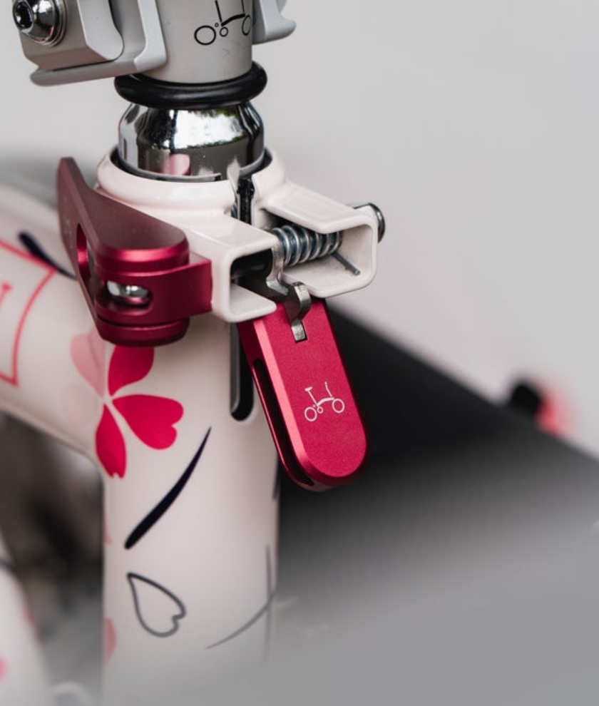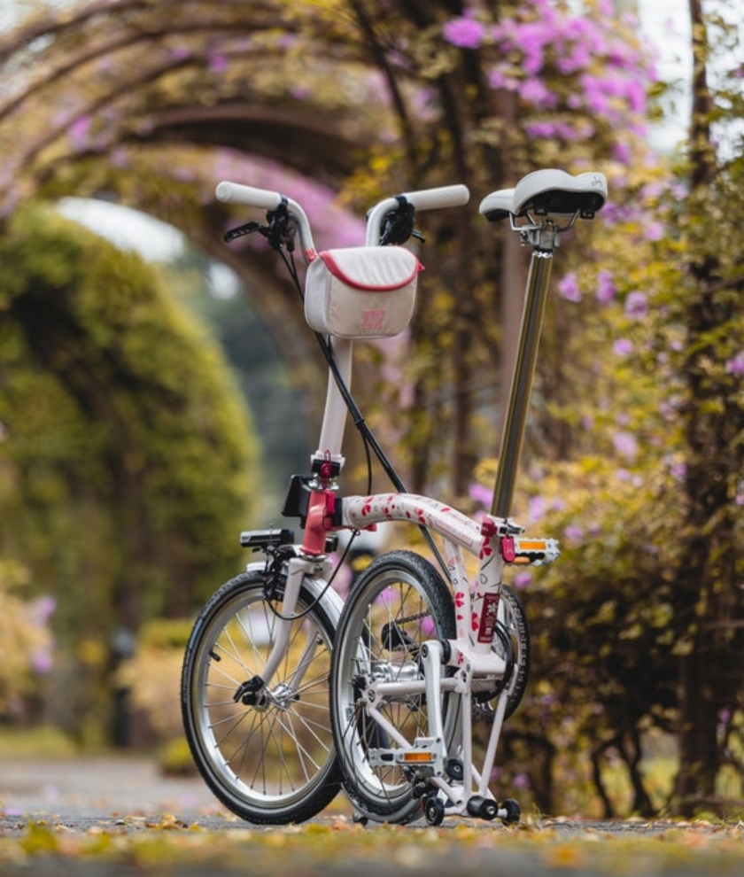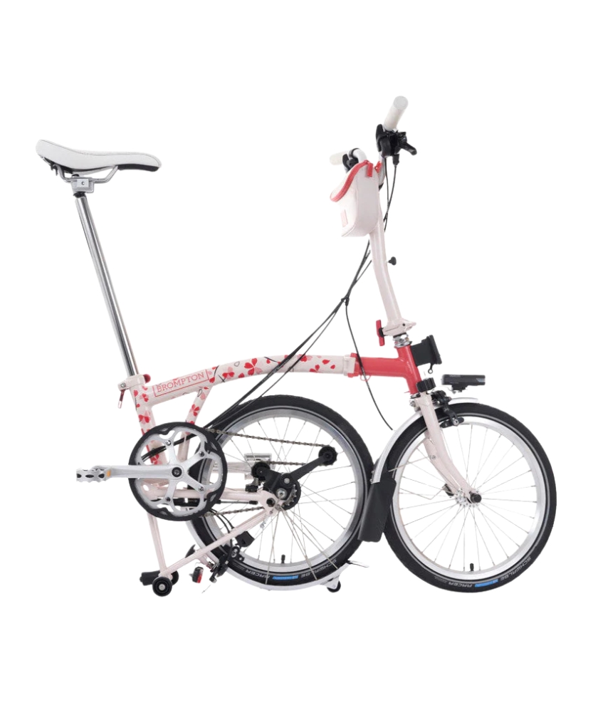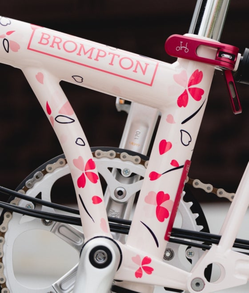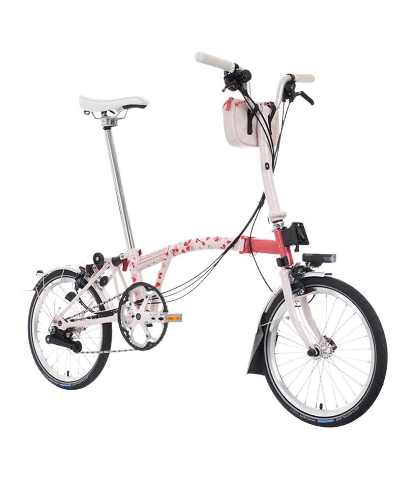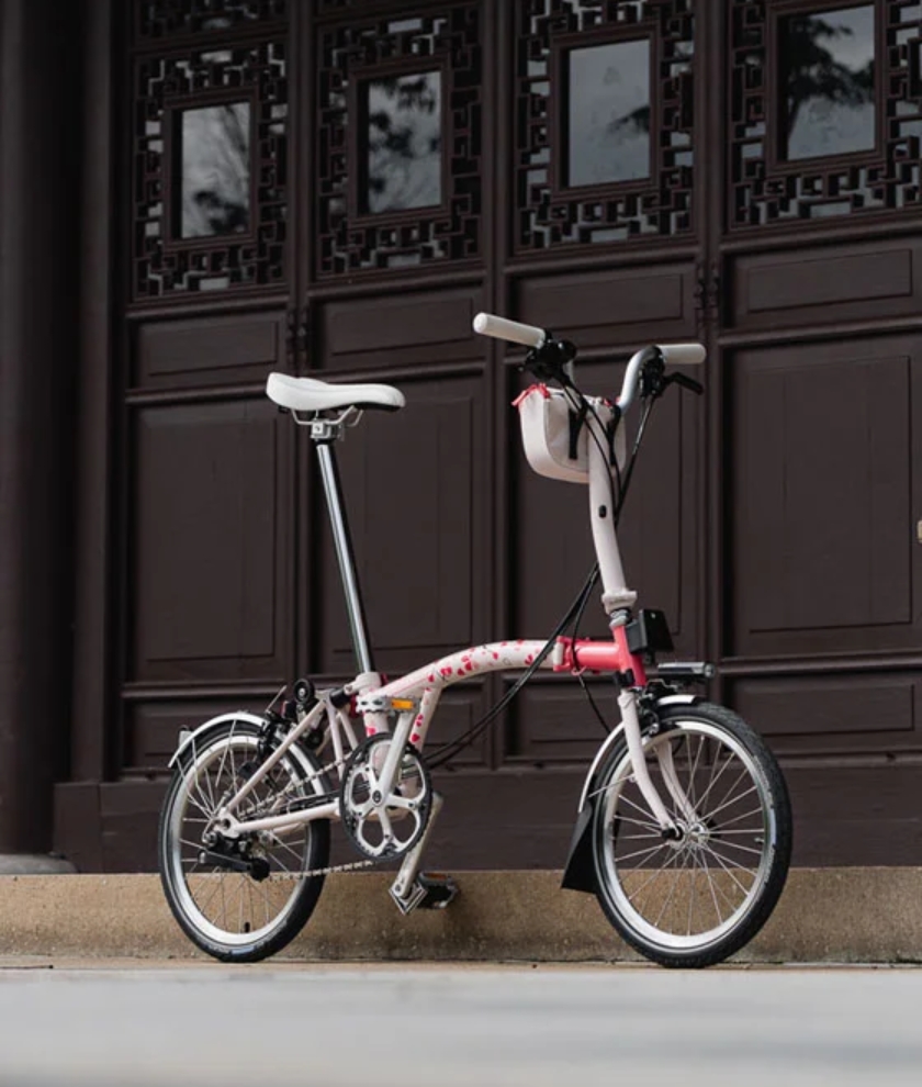 Compact and ready to explore. The Cherry Blossom Special Edition C Line brings a distinctly Asian perspective to the Brompton bike. Inspired by the deep connections with nature and each other, delicate tones and prints exude warmth and confident self-expression. The Cherry Blossom bike gives you all the practicality of the Brompton package: lightweight, portable, and folding, while the unique design signifies the joy the package can bring.