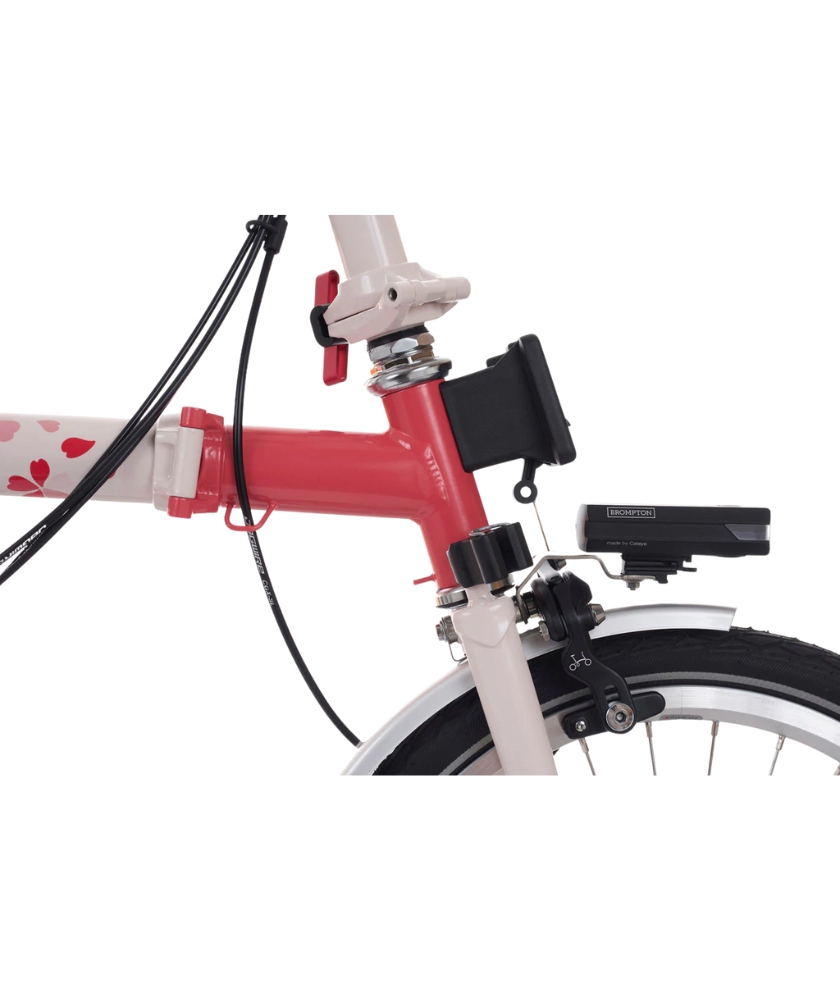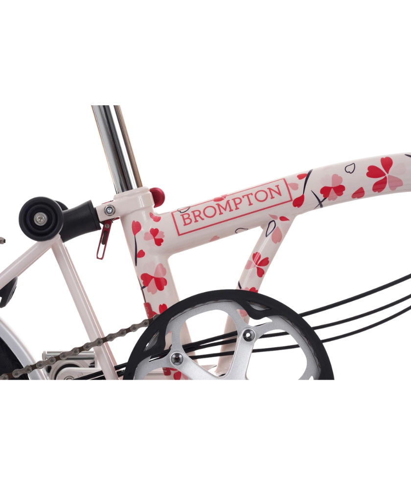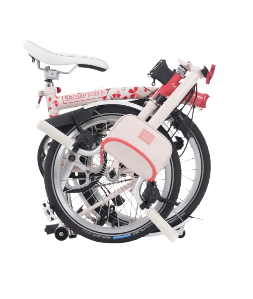 Our second Cherry Blossom Special Edition C Line bike gives you all the practicality of Brompton, lightweight, folding and portable, in a beautiful blossom-inspired package. The durable hand-built frame is finished in shades of pink with an illustrated floral print design – silver parts, white grips, and saddle complements the delicate tones. We selected proven components to deliver you swiftly, safely and in style from your door to your destination. The six gears cover all situations, from short, flat rides to explorations further afield. Super puncture-resistant Schwalbe Marathon Racer tyres happily roll from road to pebble path. And, of course, there is a pouch made especially for this bike and your ride-out essentials.