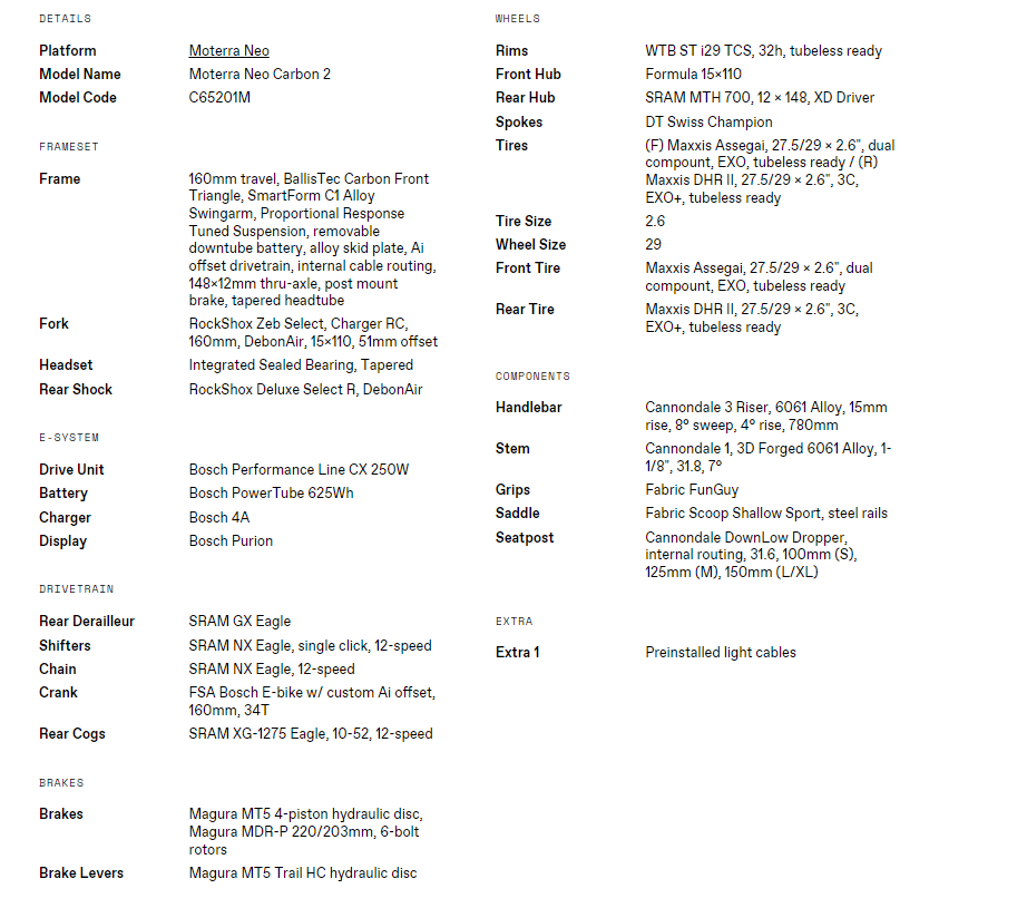 Specifications for Moterra Neo Carbon 2 E-Bike