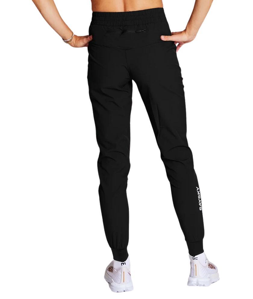 The SAYSKY Pace Pants are an all-time favorite. It's a casual pair of running pants, designed to go fast on the run and look cool on the go. It's a unisex pants with a narrow fit from the knees and down to the ankle cuffs. They come in black with a reflective woven SAYSKY label in white and a small reflective print on the left calf.