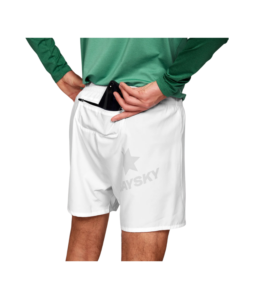 The SAYSKY Pace Shorts 5'' are a classic pair of running shorts - just a whole lot better. This is one of the all-time best-sellers and for good reasons. They're incredibly lightweight and breathable, with a regular fit designed for high performance. This version is white with a woven SAYSKY label on the front and a SAYSKY logo on the back.