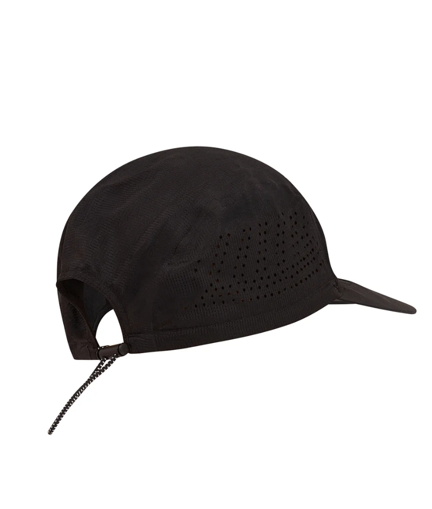 Cut from breathable, quick-drying polyester, its five-panel design wraps close for a secure fit. Laser-cut side vents regulate temperature on the move, while the elliptical peak shields from glare and downpour without obstruction.