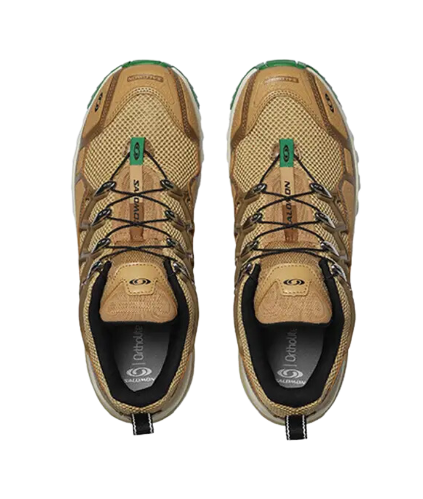 This ACS + OG has a “Black/ Lunar Rock/ Alloy” colour palette. The base of the shoe is black 3D open mesh. The synthetic overlays are in dark grey Lunar Rock and a lighter Alloy shade. The Quicklace system features slender red rope-like laces. The tongues show off Salomon branding in blue, yellow and red. The Lunar Rock-coloured insoles are equipped with Ortholite technology. The off white-coloured EnergyCell midsole works in tandem with the Agile Chassis System, providing stability to the wearer. A black rubber outsole with high-traction Mud Contragrip finishes off the look of this sneaker.