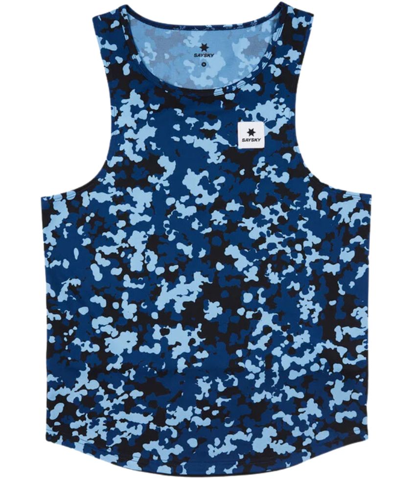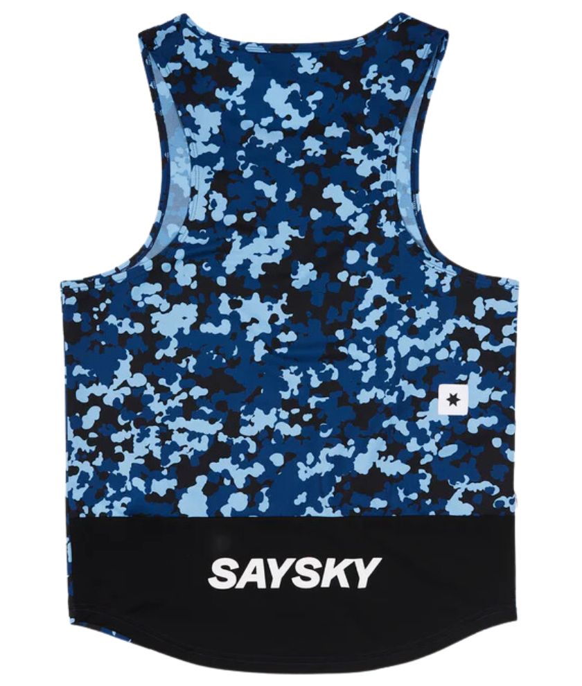 SAYSKY's Camo Combat Singlet is a regular race singlet for men. It has a blue fleck-turn camouflage print pattern and white SAYSKY logo patches on the front chest and back side. This singlet has excellent moisture absorption and quick drying properties, and maintains good air flow while ensuring high breathability. It's made with a technically structured fabric that reduces clinging of the fabric to your skin. It uses a highly functional lightweight material that is soft to the touch and highly flexible.