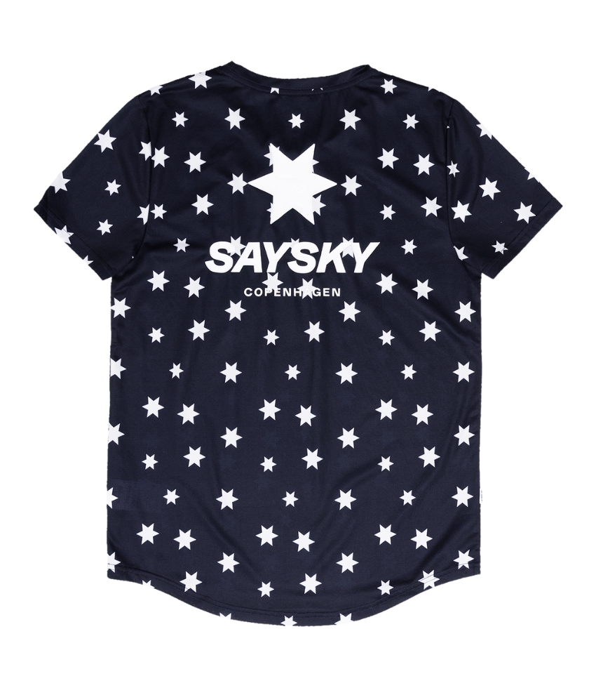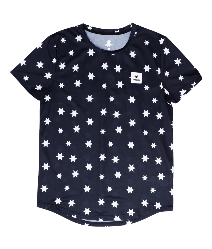 The SAYSKY Star Combat T-shirt is a running T-shirt with an all over SAYSKY star print. The shirt is moisture-wicking and quick-drying, ensuring high performance during your entire run. The technical construction reduces the fabric’s ability to cling to your skin. It is perfect for running in warmer weather, layering and as your race day outfit.
