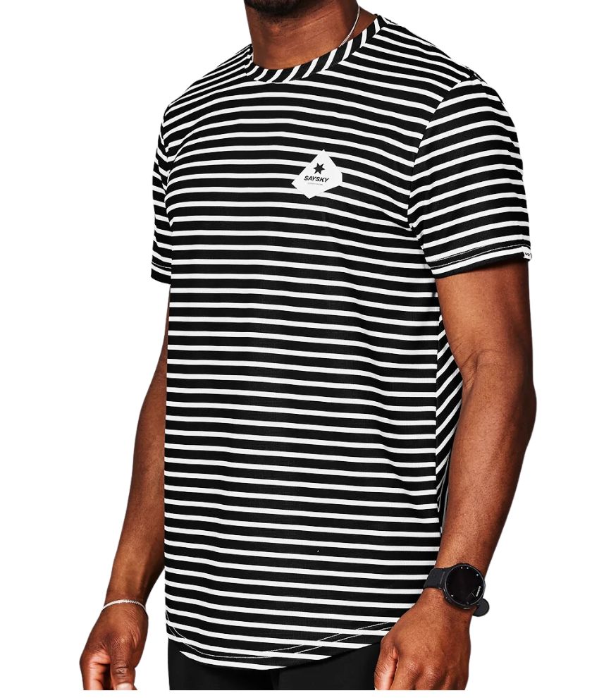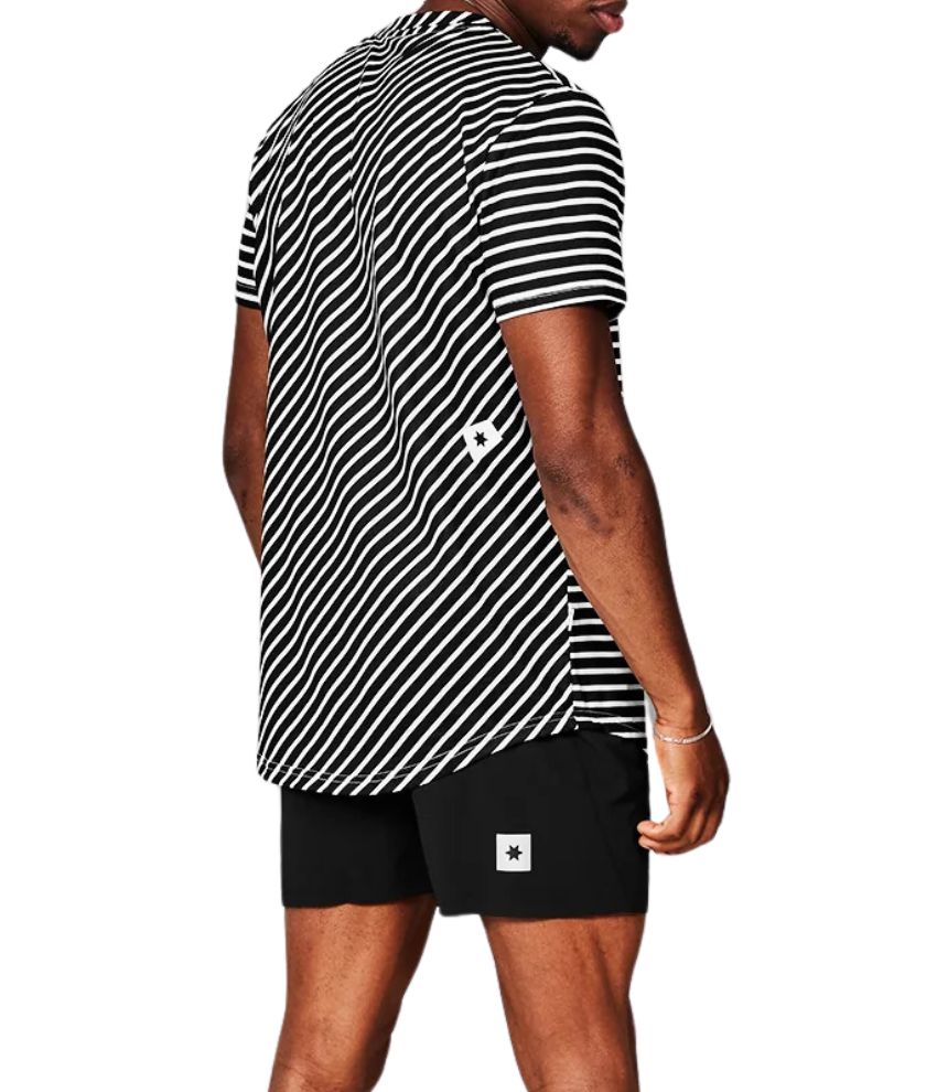 The SAYSKY Stripe Combat T-shirt is a men's short sleeve running t-shirt in striped print with asymmetrical woven labels on the front and back. The T-shirt is moisture-wicking and quick-drying, which ensures high breathability and increased airflow. The technical construction reduces the fabric’s ability to cling to your skin. It is made of 68% recycled polyester, which is a high-performance lightweight material that feels soft against the skin and offers high flexibility.