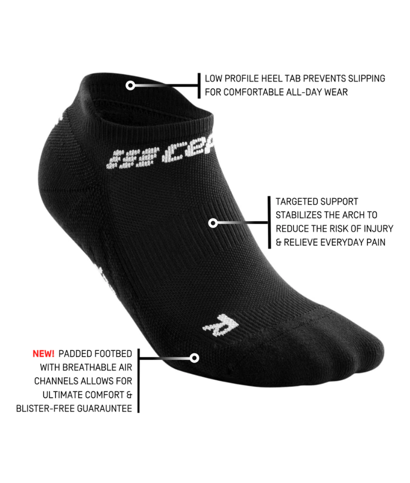 The Run Compression No Show Socks by CEP do their work behind the scenes- Get invisible support and maximize comfort. Thanks to their second skin-like fit, these no show running socks don't slip and their proven blend of materials prevent blisters. Targeted compression in the arch allows for additional support in the arch and plantar, while padded zones in the foot increase your running comfort and prevent hot spots. The advanced ventilation zones guarantee comfortable and dry feet. Perfect for the days when you head straight from the office to the gym!