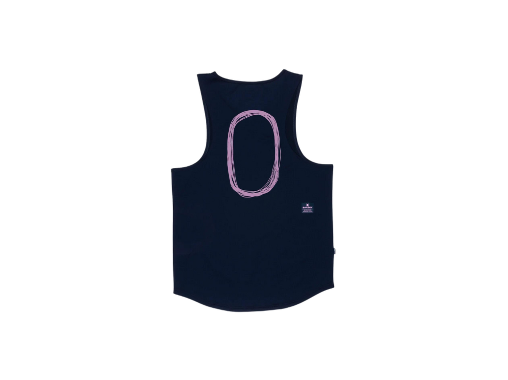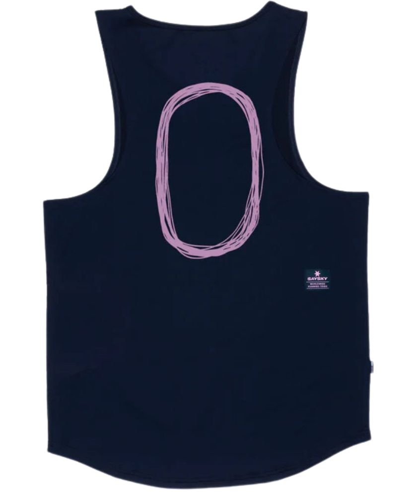 The SAYSKY Track Street Combat Singlet is a unisex race singlet in maritime with a purple track print on the back. The fabric is super light and breathable, making for a very comfortable running experience. It comes with a SAYSKY logo on the front and the back. The fit is regular and ideal for both training and racing.