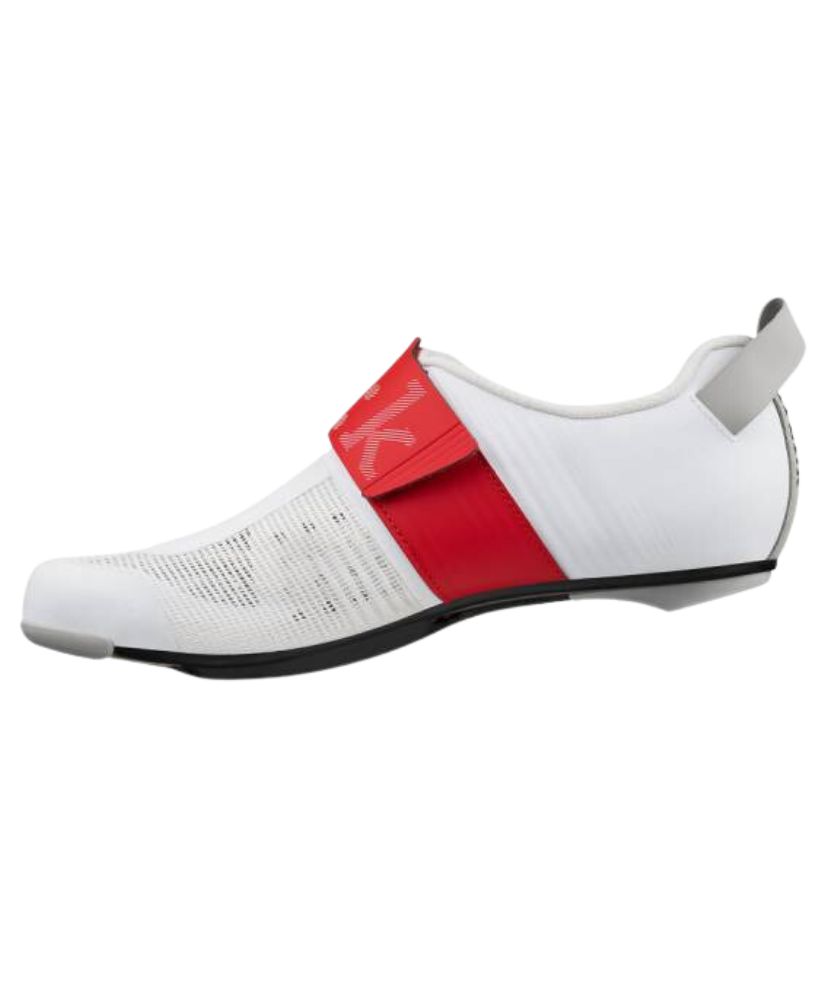 At the base, the R2 outsole’s engineered carbon-fiber layup saves weight and delivers increased stiffness, with a stiffness index rating of 10, making this outsole the most responsive in the fizik range. A wide vent inlet and deep internal channeling provide cooling airflow to aid in temperature regulation. The cleat positioning is set slightly further back compared to traditional settings to optimize pedaling efficiency and reduce knee compression—especially well-suited for very aggressive, forward aero positions typically adopted by triathletes.
