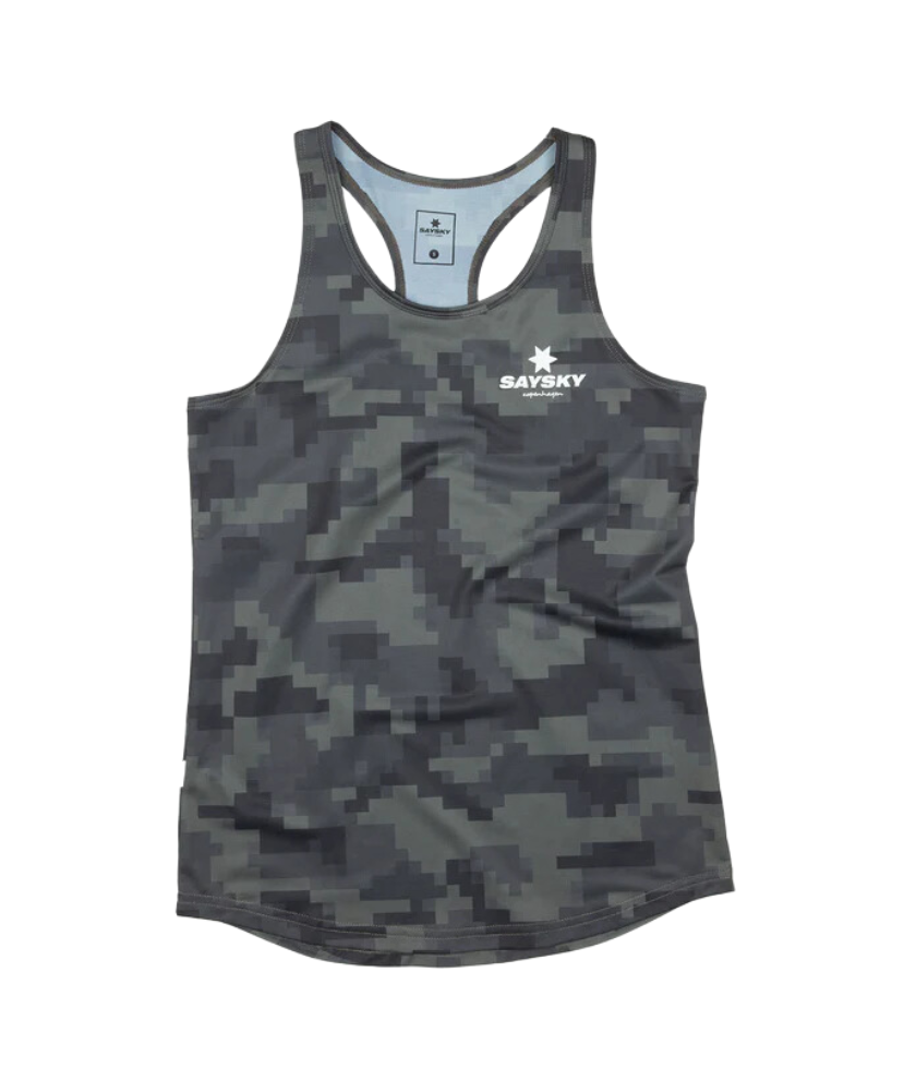 The SAYSKY Women's Camo Combat Singlet is a racing singlet designed with a green pixel camouflage print. The front chest has a classic white SAYSKY logo, and the back has a SAYSKY logo patch. The slim-fit design and ultralight, breathable fabric make this singlet perfect for racing runs.